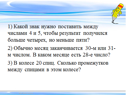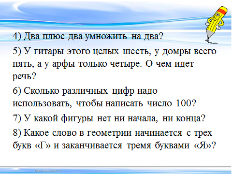Разминка (шуточные задачи) (3 минуты) | - Отложите ручки, и немножко отдохнем. Не относитесь к этим задачам серьезно, вы неизбежно потерпите неудачу.