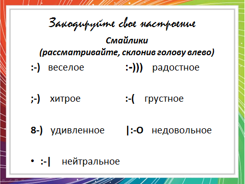 Рефлексия (1 минуты) | Проверим результаты работы, и оценим себя 5 заданий – «5» 4 задания – «4» 3 заданий - ? (тут надо задуматься, где пробелы в знаниях, над чем позаниматься, над какими видами задач подумать). На листочках закодируйте свое настроение. |
