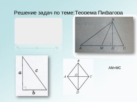 Цель урока: обобщить и систематизировать полученные знания и приобретенные умения и навыки, отрабатывать умение применять теорему Пифагора, повторить различные формулы площади треугольника, умение применять на практике теоремы и свойства различных видов треугольников. Переносить знания по планиметрии в стереометрию.