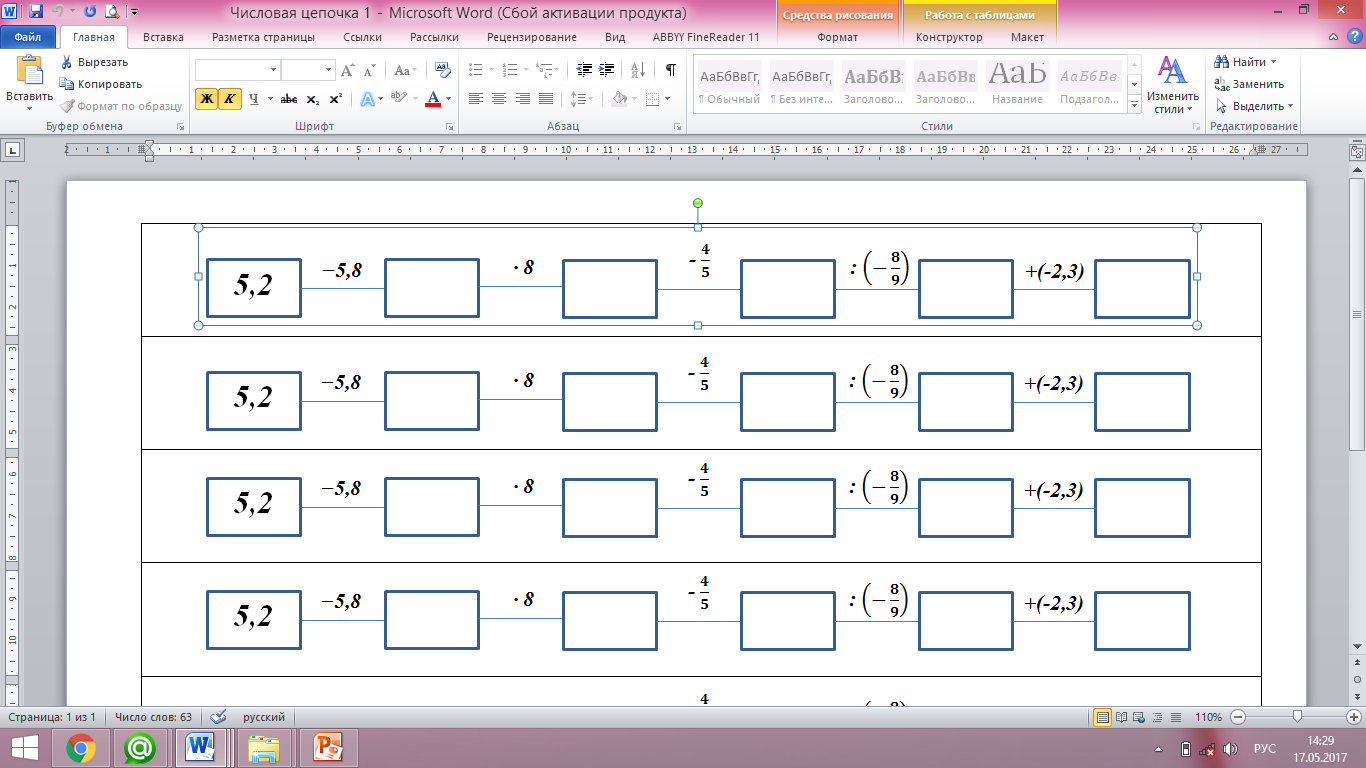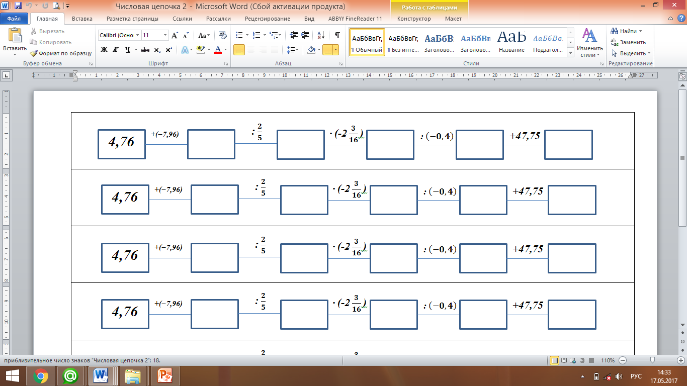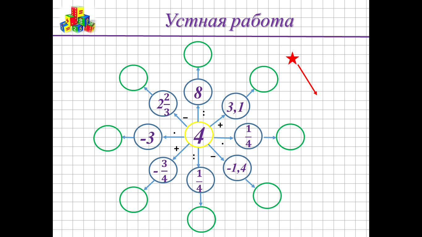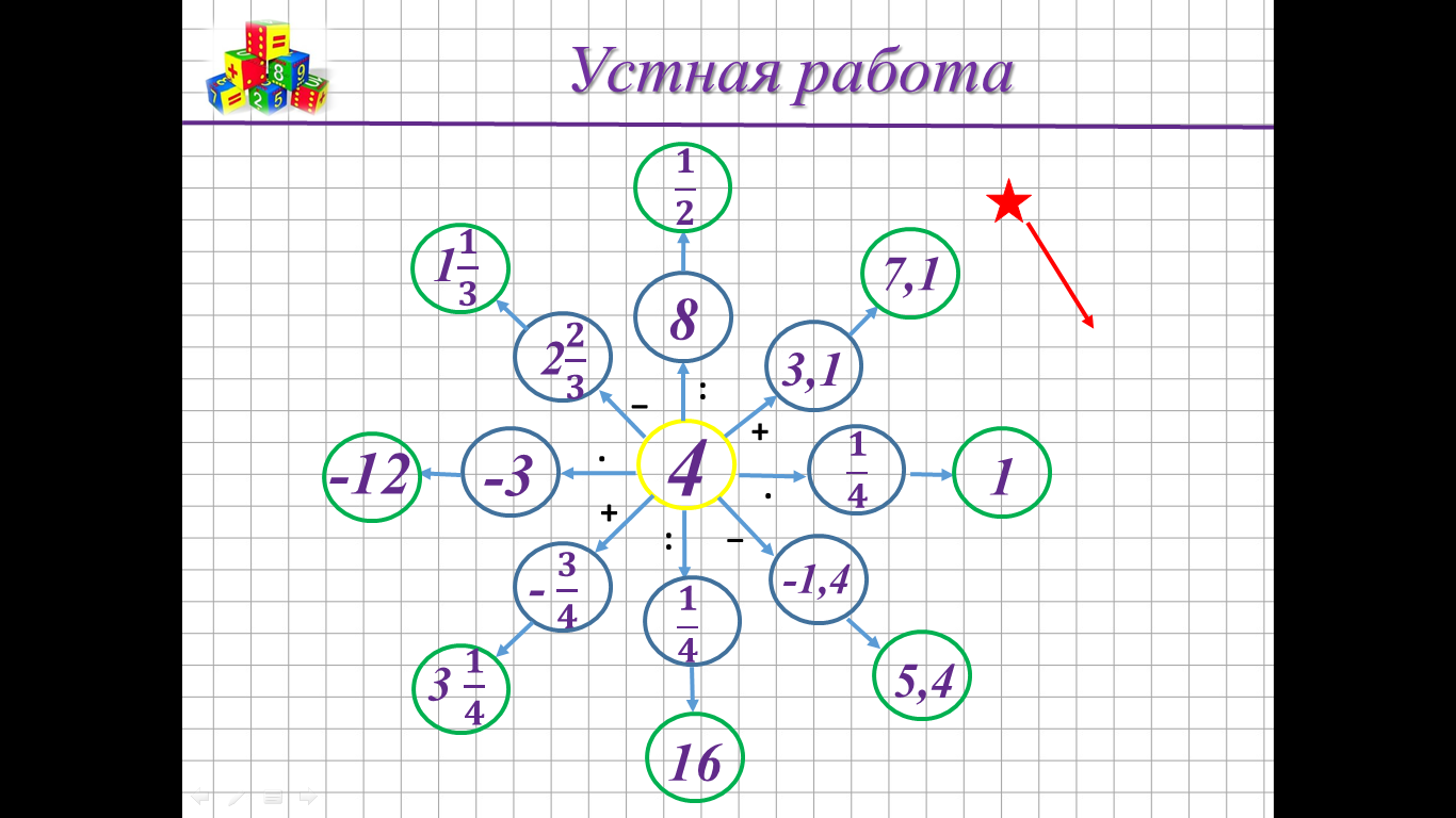 Находят значения выражений. В результате должно получиться 4. | Планировать решение учебной задачи: выстраивать алгоритм действий, выбирать действия в соответствии с поставленной задачей. Выполнять арифметические действия с рациональными числами Применять правила делового сотрудничества. Осуществлять взаимный контроль, планировать способы взаимодействия. Осуществлять контроль по результату | ||||||||||||||||||||||||||