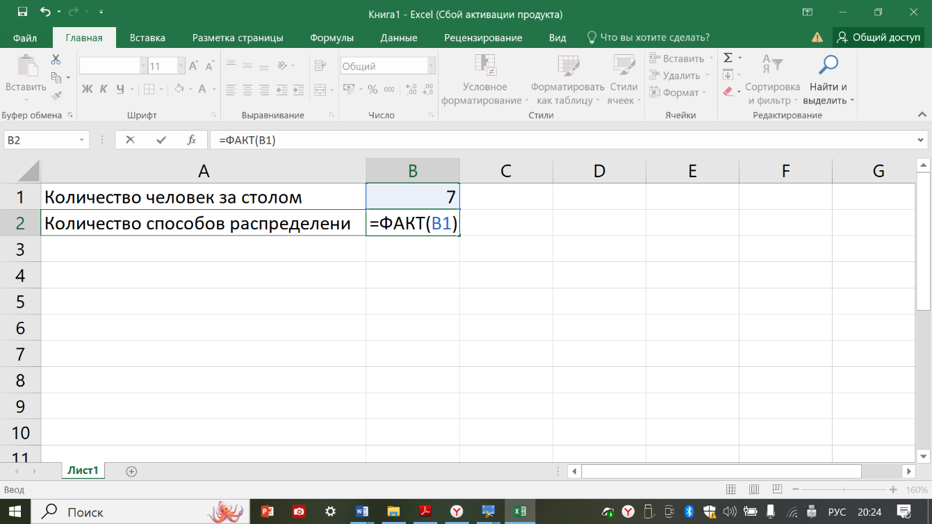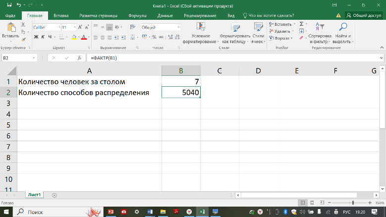 1. На соответствующем листе введите заголовок в ячейку А1 («Количество человек за столом»), в ячейку А2 («Количество способов распределения»), в ячейку В1 – подставьте значения, указанные в примере выше.