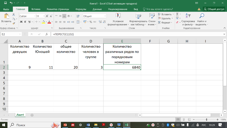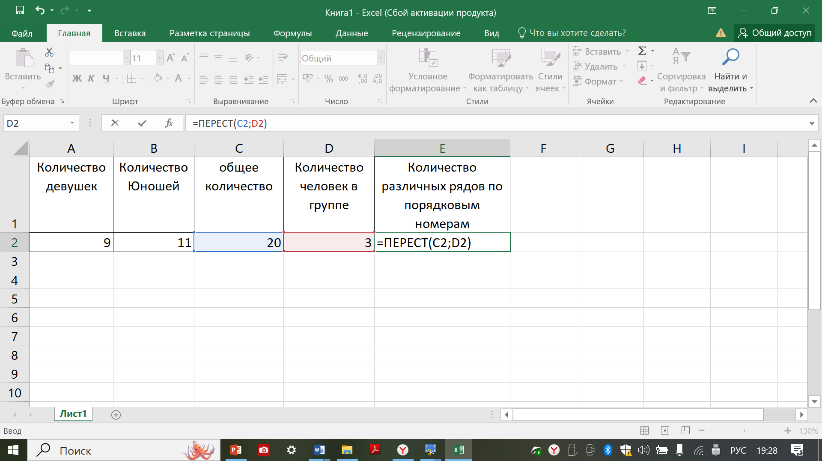 2. В ячейку Е2 введите формулу для вычисления сочетаний: =ПЕРЕСТ (С2;D2).