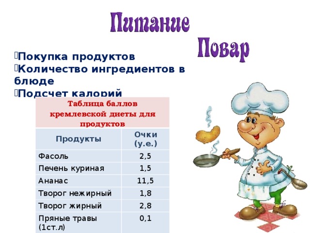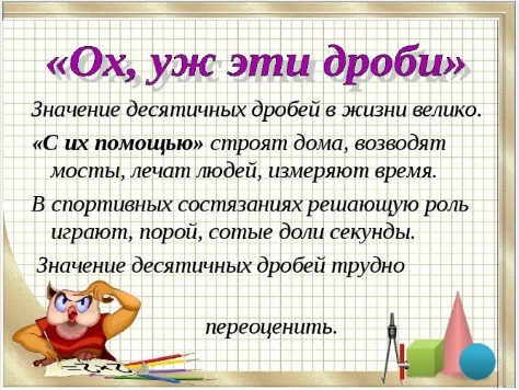 Найдите по таблице общую сумму баллов кремлёвской диеты для продуктов. Домашнее задание: приведите пример какой-нибудь профессии, где используются десятичные дроби. Придумайте задание на сложение и (или) вычитание десятичных дробей в этой профессии. | Личностные: - осознанием важности математического образования на протяжении всей жизни для успешной профессиональной деятельности и развитием необходимых умений; - необходимостью в формировании новых знаний. Предметные: выполнять арифметические действия с десятичными дробями (сложение и вычитание). | ||||||||||||||||||||||||||||||||||||||||||||