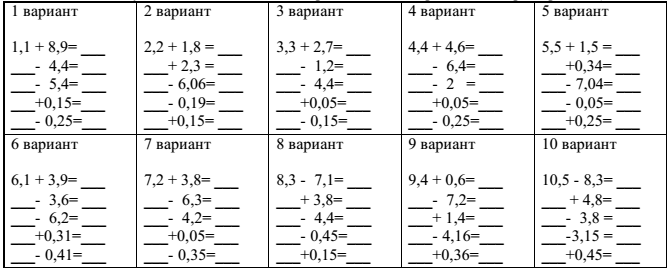 9 | Один из вариантов можно решить совместно. Дальше индивидуальная работа. Каждому из вас выдана карточка с примерами. Вычислите устно. Каждый пример, кроме первого, начинается с ответа предыдущего. Если вы сосчитаете правильно, то свой ответ найдёте среди чисел, записанных на доске, и запишите его в тетрадь. (на доске написаны числа: 0,1; 0,2; 0,3; 0,4; 0,5) Поднимите руку, когда будет получен ответ. (для быстрой проверки правильности ответа карточка составлена таким образом, что верный ответ получается вычитанием из первого числа на карточке номера варианта)