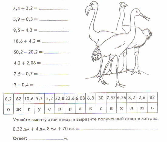 10 | Индивидуальная работа на карточке. Работу сдать учителю на проверку. Решите примеры (можно устно). Зачеркните в таблице ответы и буквы, им соответствующие. Оставшиеся буквы позволят вам прочитать название самой высокой птицы, которая обитает в России.