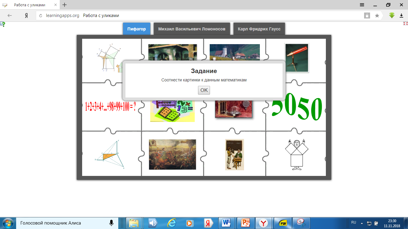 На данной страничке сайта агентам предлагается задание, где необходимо соотнести картинки к Пифагору, М.В. Ломоносову и К.Ф. Гауссу.