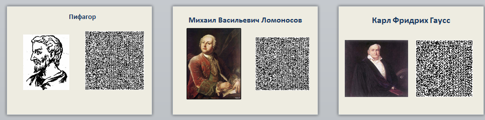 После успешного выполнения задания предлагается отсканировать QR – коды, чтобы немного узнать о великих математиках.