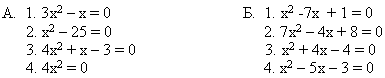 (Слайд 5) 6. А: 3- лишнее, т.к. это полное квадратное уравнение, а 1;2;3-неполные квадратные уравнения. Б: 2-лишнее, т.к. это уравнение общего вида, а 1;2;3- приведенные квадратные уравнения. Учащиеся самостоятельно выполняют работу. (Слайд 6) (Слайд 7) 7.Ответы: