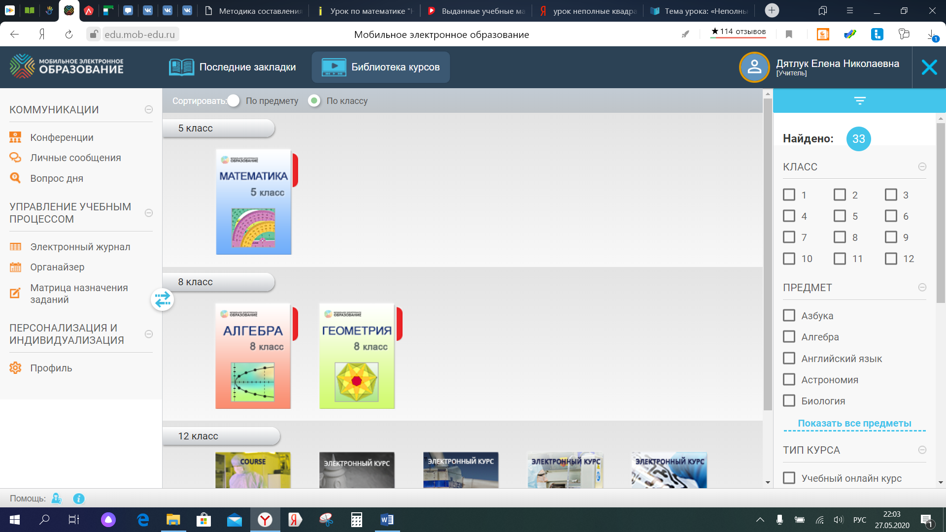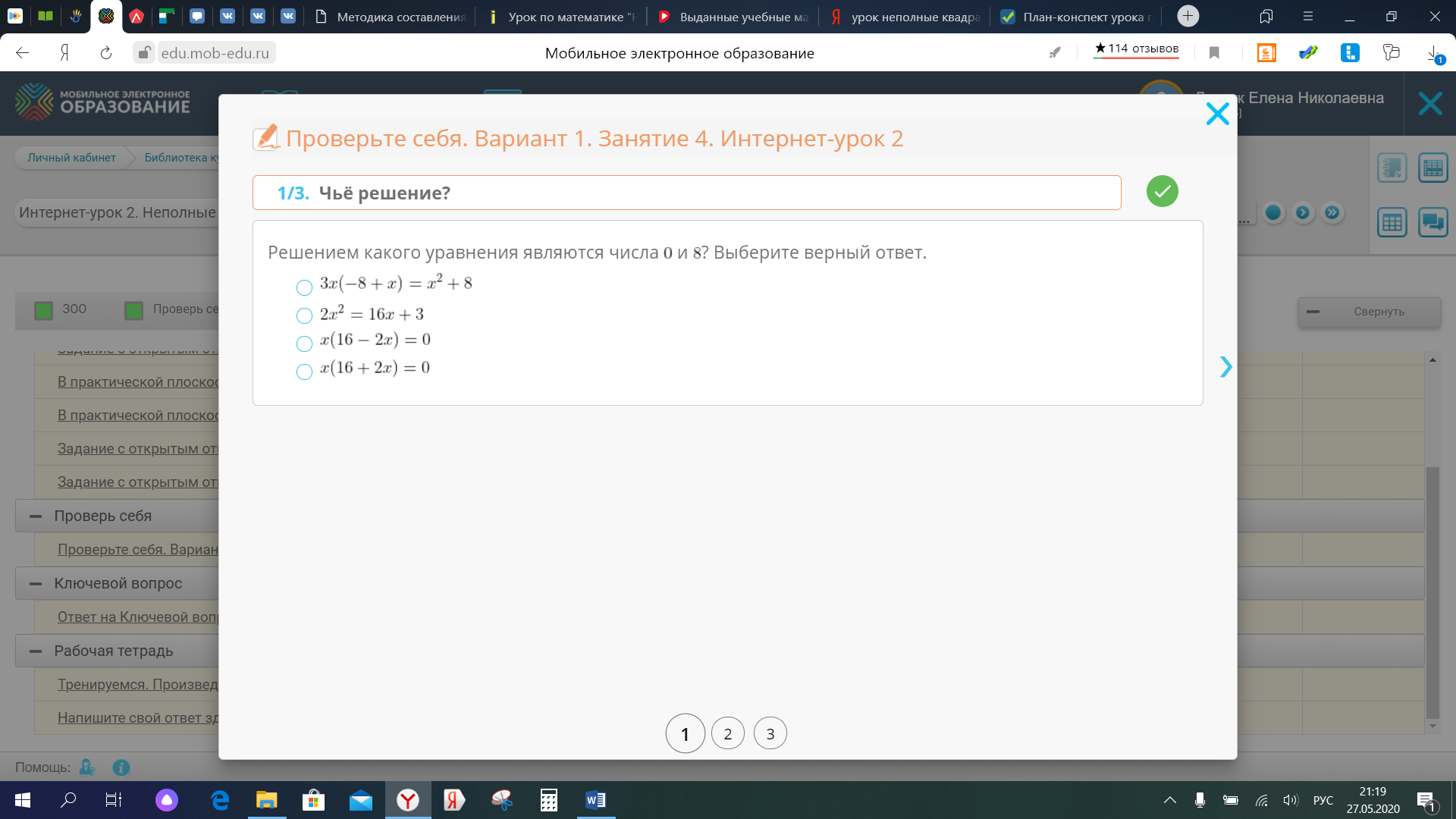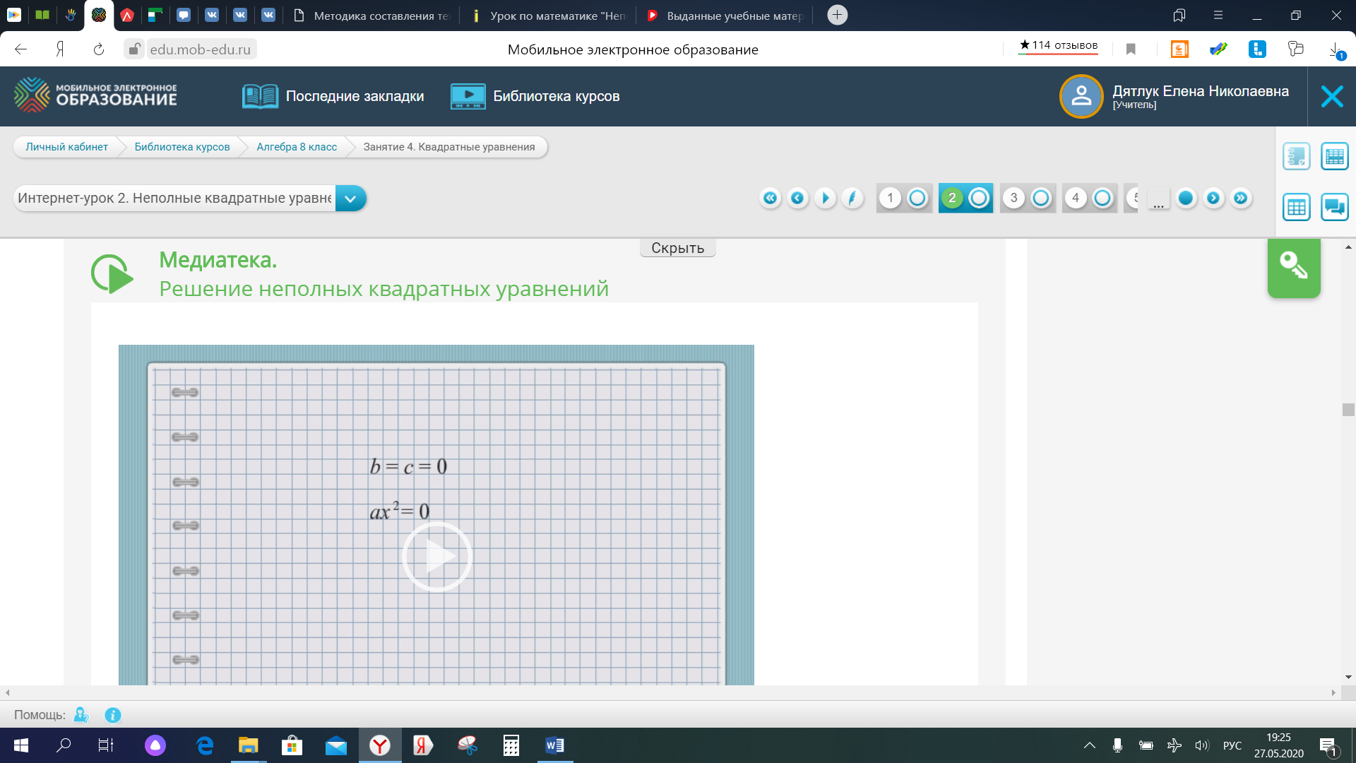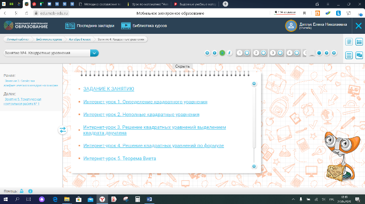 | Фронтальный Индивидуальный | Проведение самоорганизации. Проверка работоспособности компьютерного оборудования, наличия подключения к Интернету, вход обучающихся в личный кабинет МЭО, курс «Алгебра 8», занятие №4, Интернет-урок №2. |