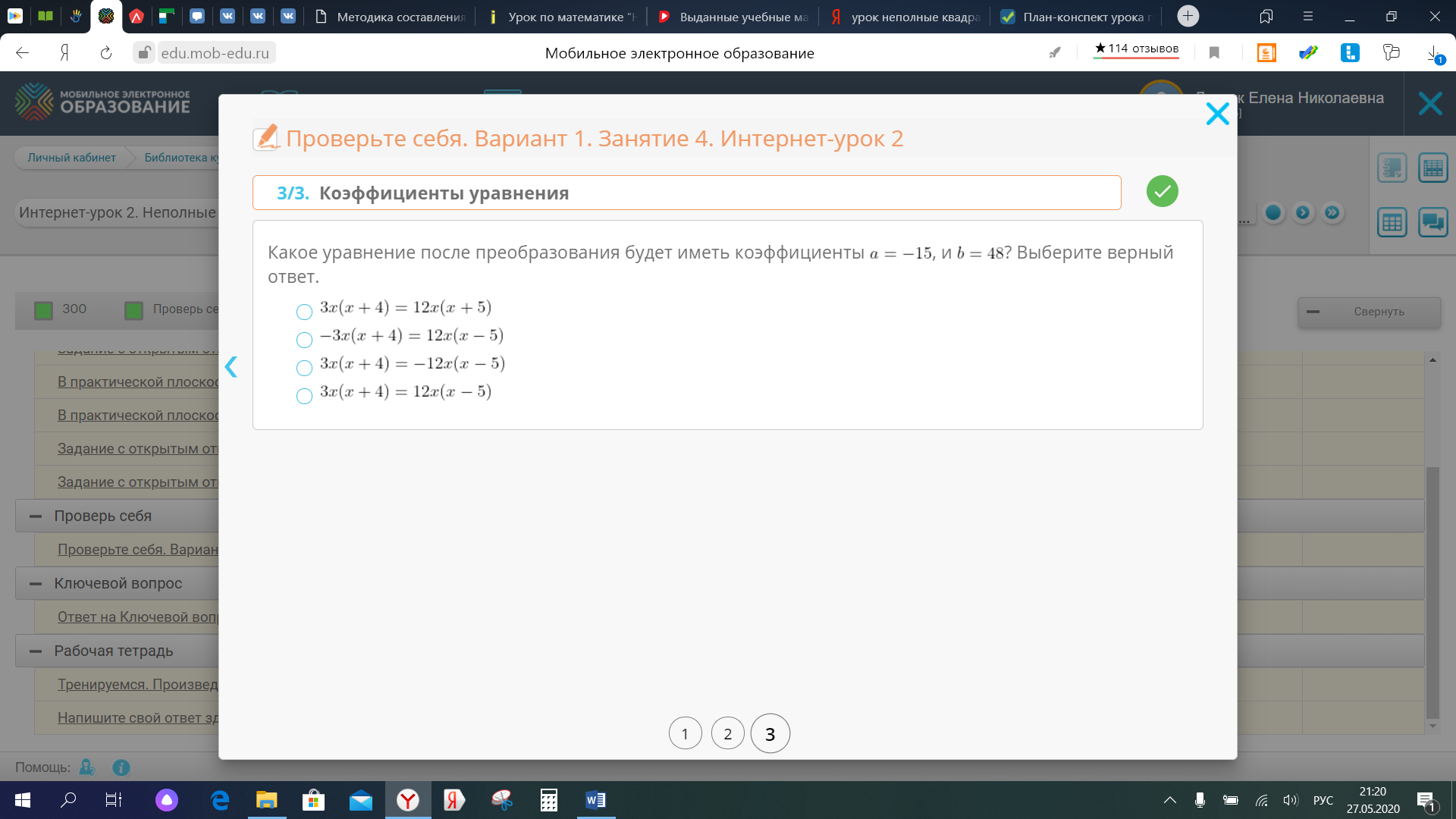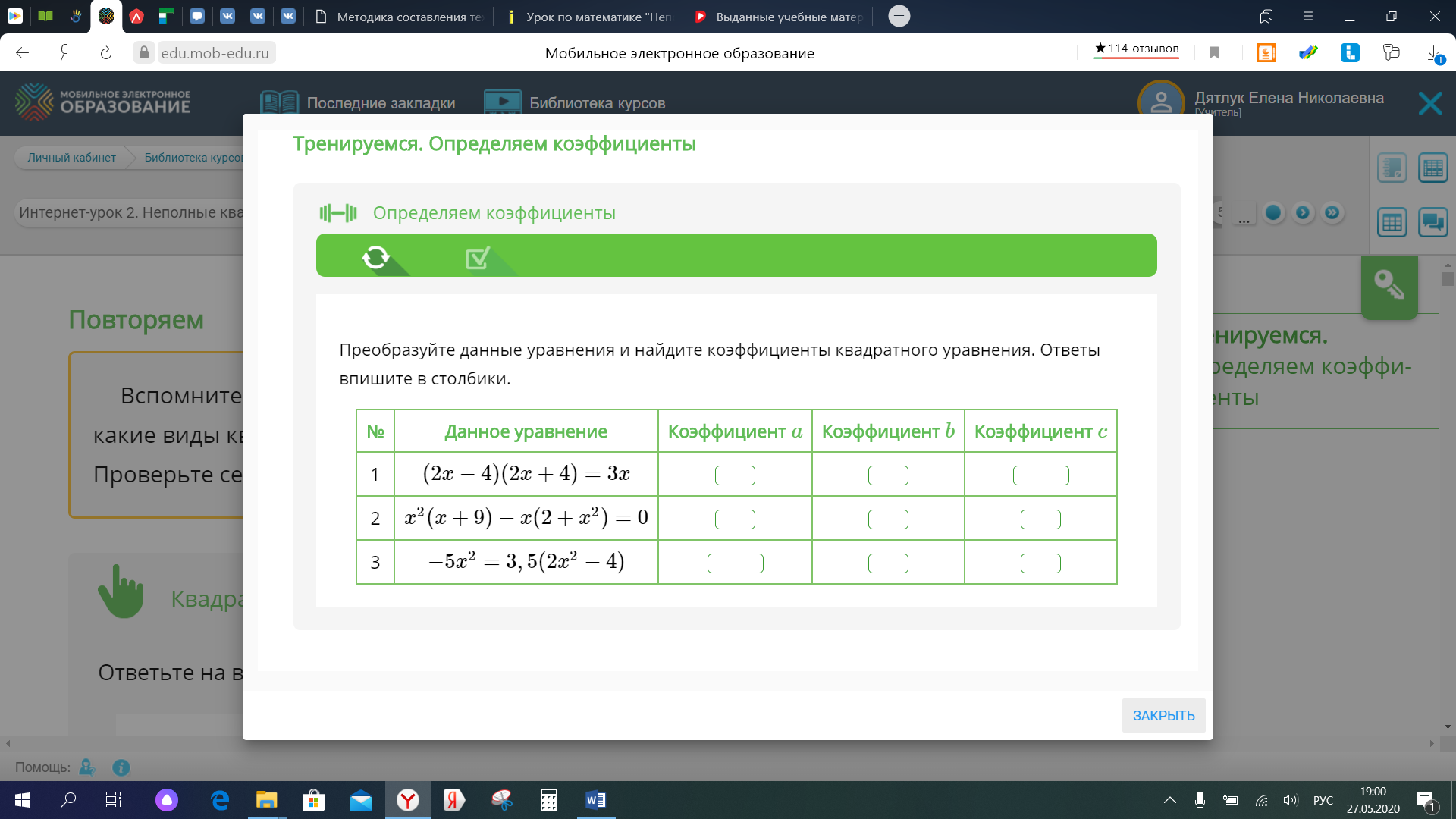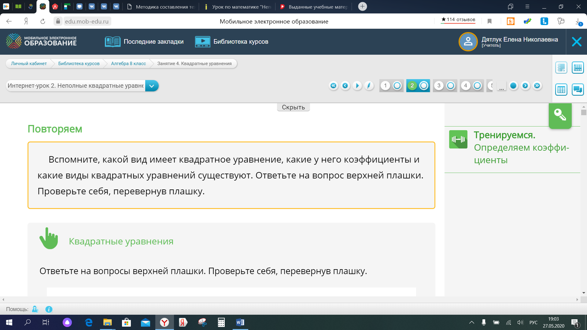 Актуализация опорных знаний. | Систематизация имеющихся знаний и выявление затруднений в индивидуальной деятельности. | Самопроверка. 1.Установить, верны ли предложенные утверждения или нет. 2. Определить коэффициенты. | МЭО, занятие №4, Интернет-урок №2 1.Задание «Повторяем».
