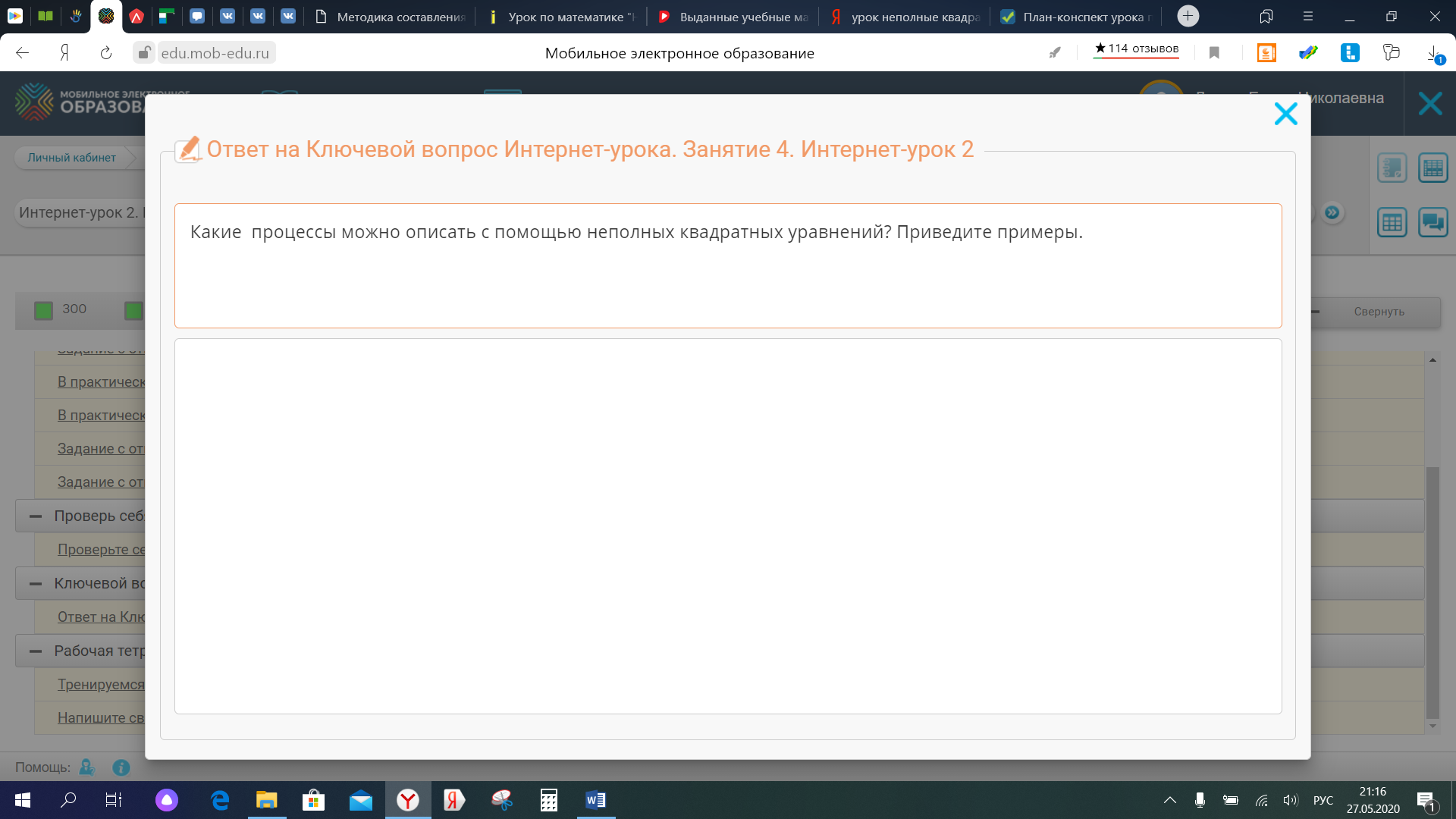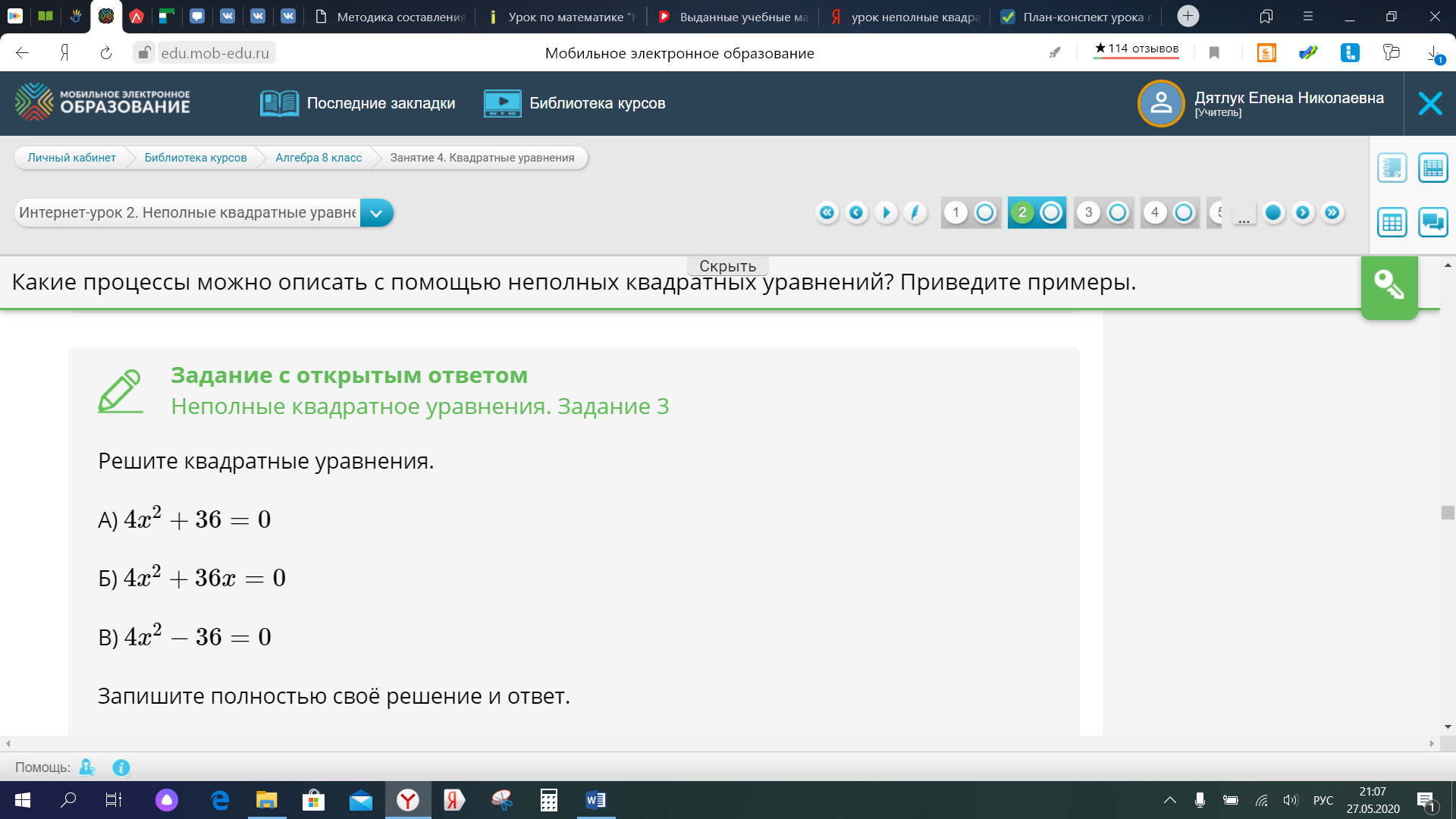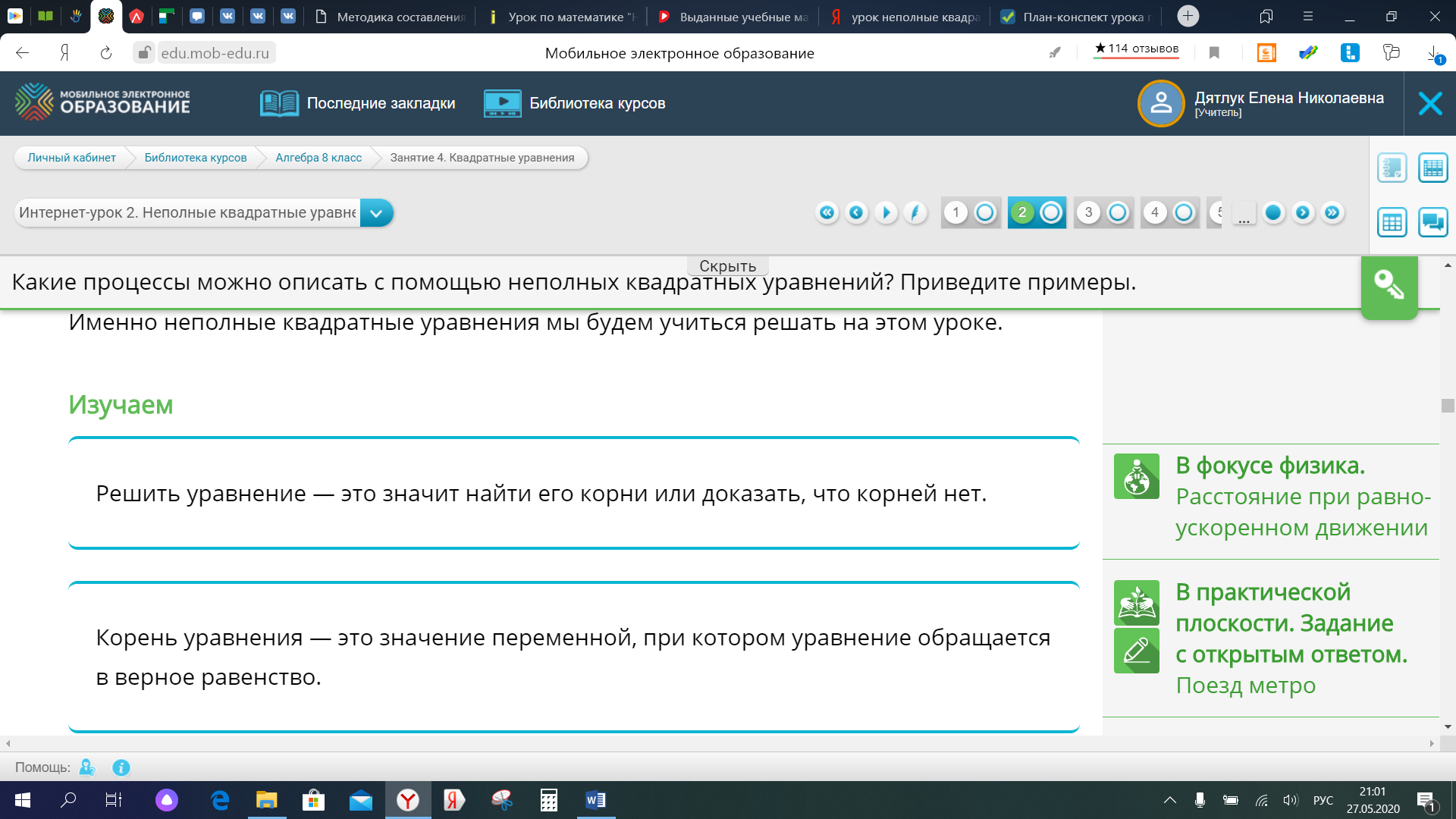 Рефлексия. | Обеспечение осознания учащимися своей учебной деятельности. | Беседа | Подведем итог работы. -Какова была цель урока? -Достигнута ли цель? -Что нового узнали? -Что вызвало затруднение? -Для чего нужны неполные квадратные уравнения? (ответ на КВ Интернет-урока). | Фронтальный | Отвечают на вопросы, обобщают знания о новом материал, обсуждают затруднения и применения неполных квадратных уравнений в разных предметных областях. Осуществляют самооценку. |