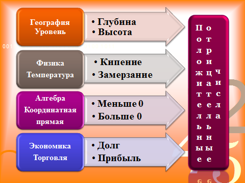 5 | Проблемная ситуация. Учитель: Где используется в жизни понятие положительного и отрицательного числа? Как будем узнавать их? Предлагайте свои способы.