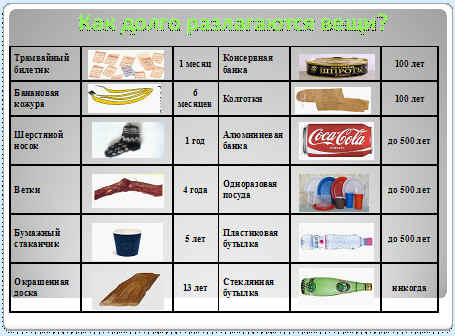 Игра. Двое человек поочереди как можно точнее называют срок разложения предметов из различных материалов. Кто ближе к истине, тот выигрывает.(получает приз) третий человек из аудитории – в жюри. Подстчитывает количество более близких ответов, после игры всем раздает таблички – в подарок.