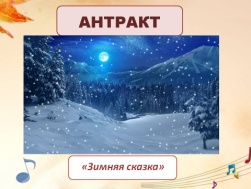 «Антракт» | Звенит звонок, закончился первый акт, и нас ждет антракт! Приготовились к исполнению песни «Зимняя сказка». И опять звонок зовет нас на второй акт. | Хоровое исполнение песни «Зимняя сказка» | М | 3 мин. | |