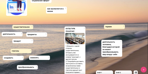 Задание: 1. Впишите с одной стороны существительные, которые у вас ассоциируются со словом "культура", с другой глаголы 2. Попробуйте доставить части речи и составить из выписанных вами существительных и глаголов единый текст (получится термин ) | |||||