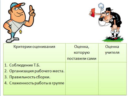 Учитель контролирует правильность приемов работы, объем и качество выполненного изделия, соблюдение норм безопасности во время работы. Помогает учащимся, испытывающим трудности в процессе деятельности | Осуществляют взаимоконтроль. Выполняют задание: планируют работу, обсуждают ее, распределяют общий объем работы; используют освоенные приемы соединения деталей конструктора; приводят в порядок рабочее место после окончания сборки. | Познавательные: организовывают творческое пространство. Познавательные: ориентируются в иллюстрированной инструкции, находят информацию о каждом этапе или запрашивают эту информацию у учителя. Коммуникативные: задают вопросы для уточнения последовательности работы и техники исполнения ее. Регулятивные: контролируют свои действия по точному и оперативному ориентированию в инструкции. Личностные: имеют желание работать, понимают значимость правильной организации рабочего места, знают правила поведения на уроке |