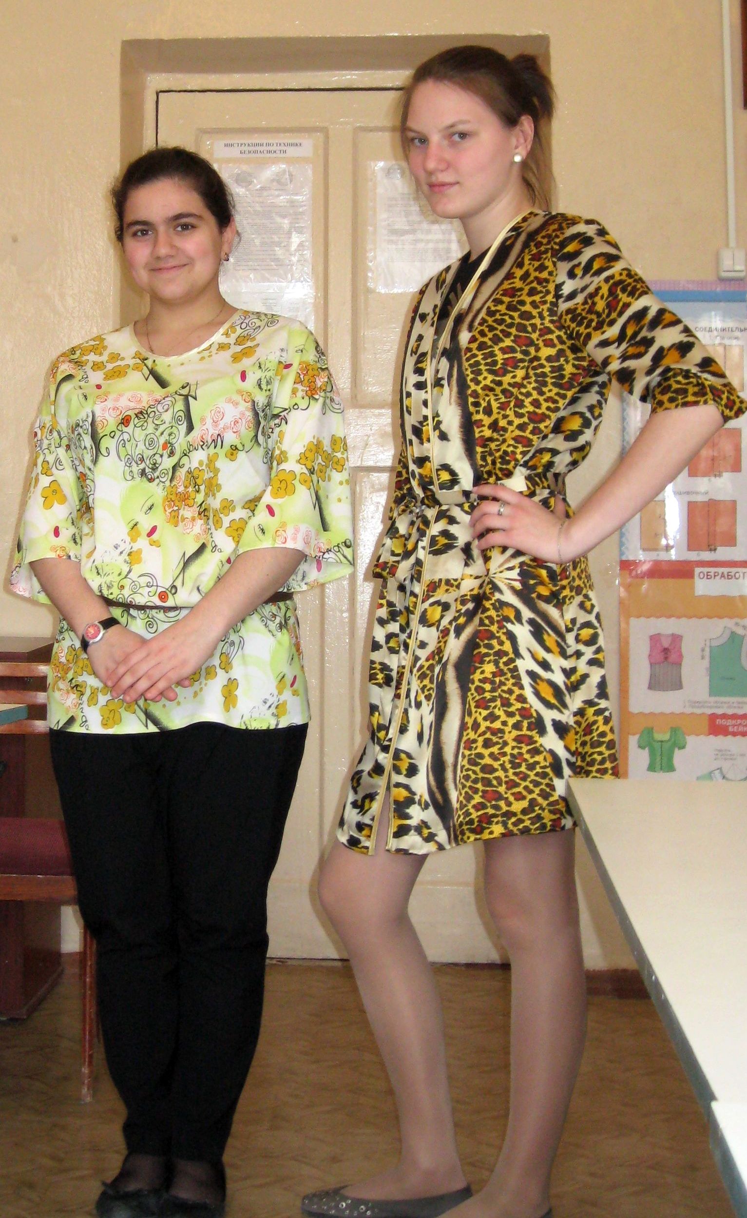 Швеи: «В нашу задачу входит выполнить под контролем технолога все операции по схеме. Работать надо аккуратно, точно и быстро. Для этого у нас есть различные машины, которые помогут облегчить работу и улучшить качество. У нашей машины «Чайка» есть различные приспособления. С их помощью можно обработать швы строчкой «зиг-заг», предохранить их от осыпания. Можно при помощи специальной лапки ровно подшить низ изделия. (Показывает на готовом изделии, которое висит на плечиках рядом). Можно ровно настрочить подкройную бейку и косую бейку, отделочную строчку. Рассказывает, как выполнить обработку рукава, пояса и др. Окончательная обработка производится с помощью современных утюгов с отпаривателем». Качество изготовления изделия проверяет технолог.