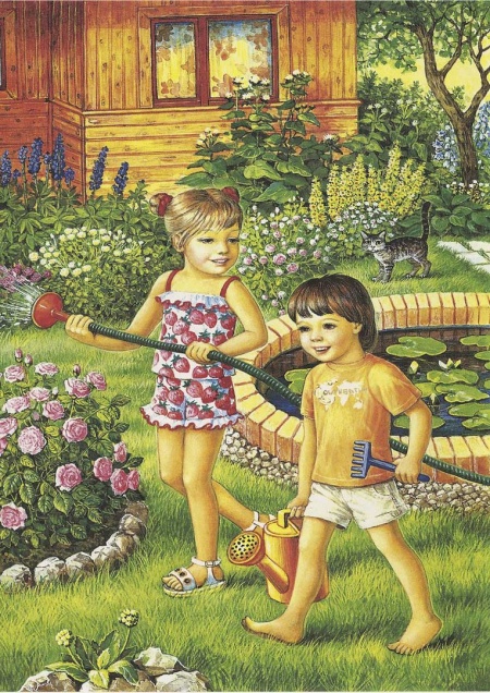 По взмаху волшебной палочки одна песочница превращается во фруктовый сад, другая — в огород. Детям предлагается посадить сад и огород. После выполнения задания дети рассказывают, что где растет. Взрослый просит ребенка описать овощи и фрукты по форме, цвету, вкусу.