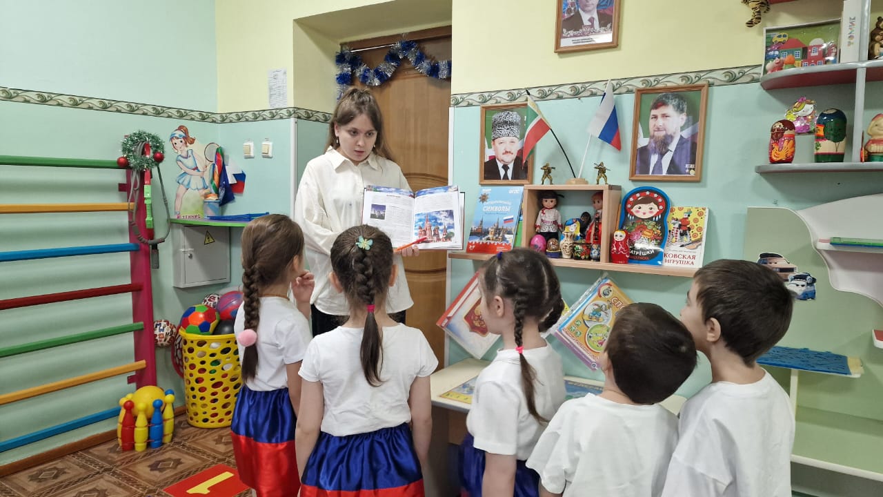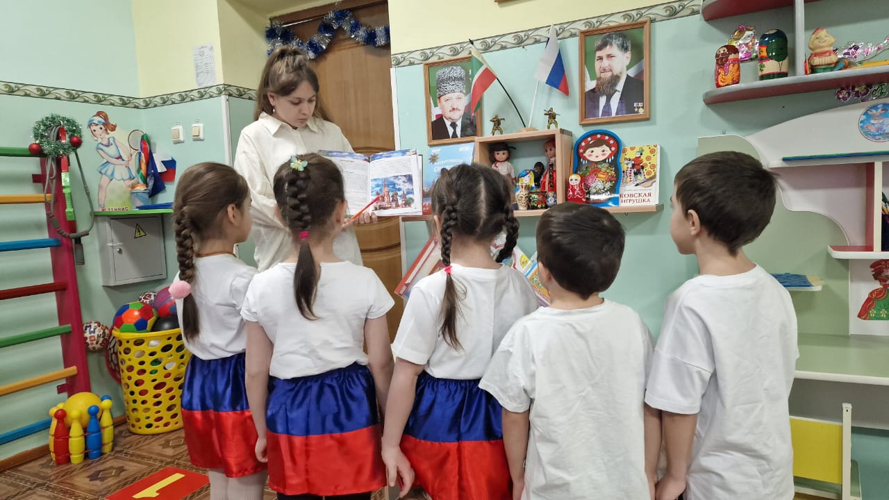 Затем Воспитатель рассказывает о столице России — городе Москве, показывая иллюстрации с изображением главной достопримечательности — Московского Кремля.