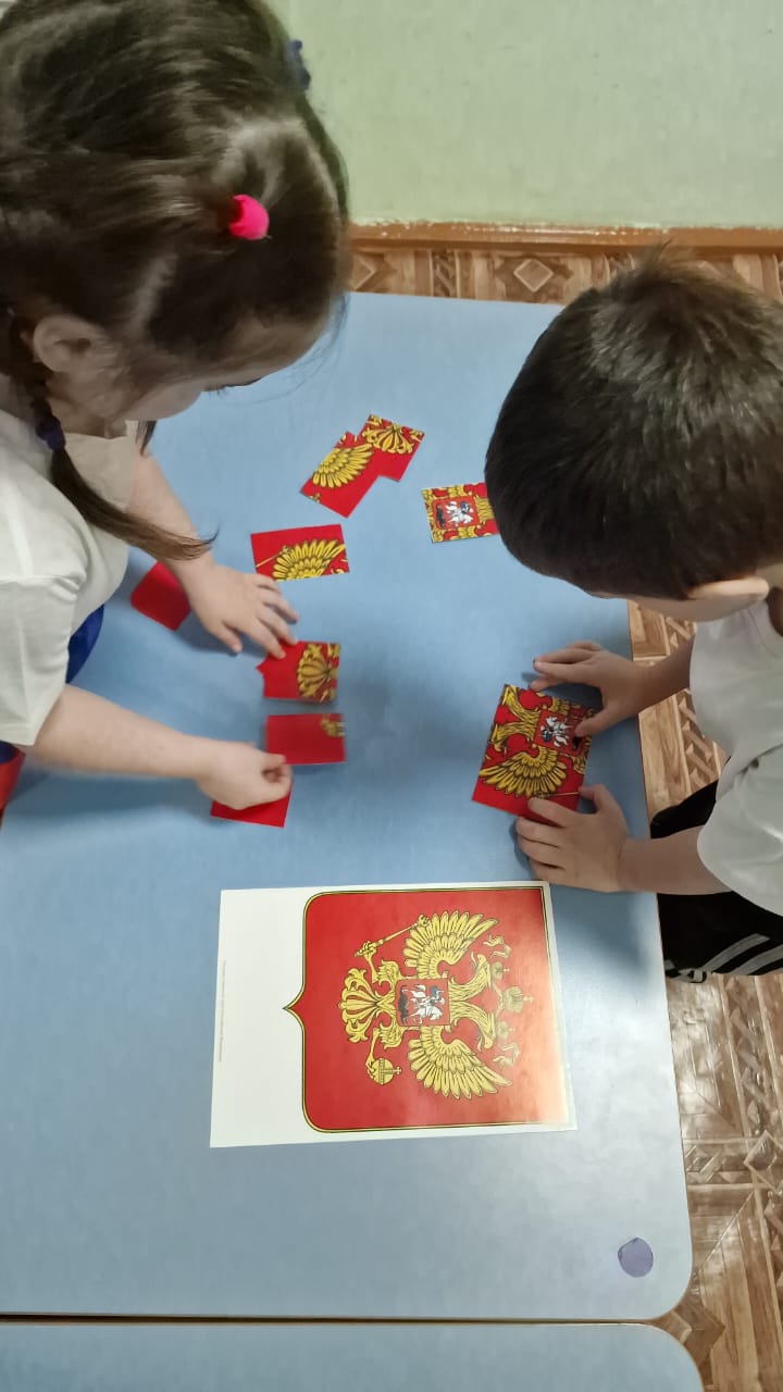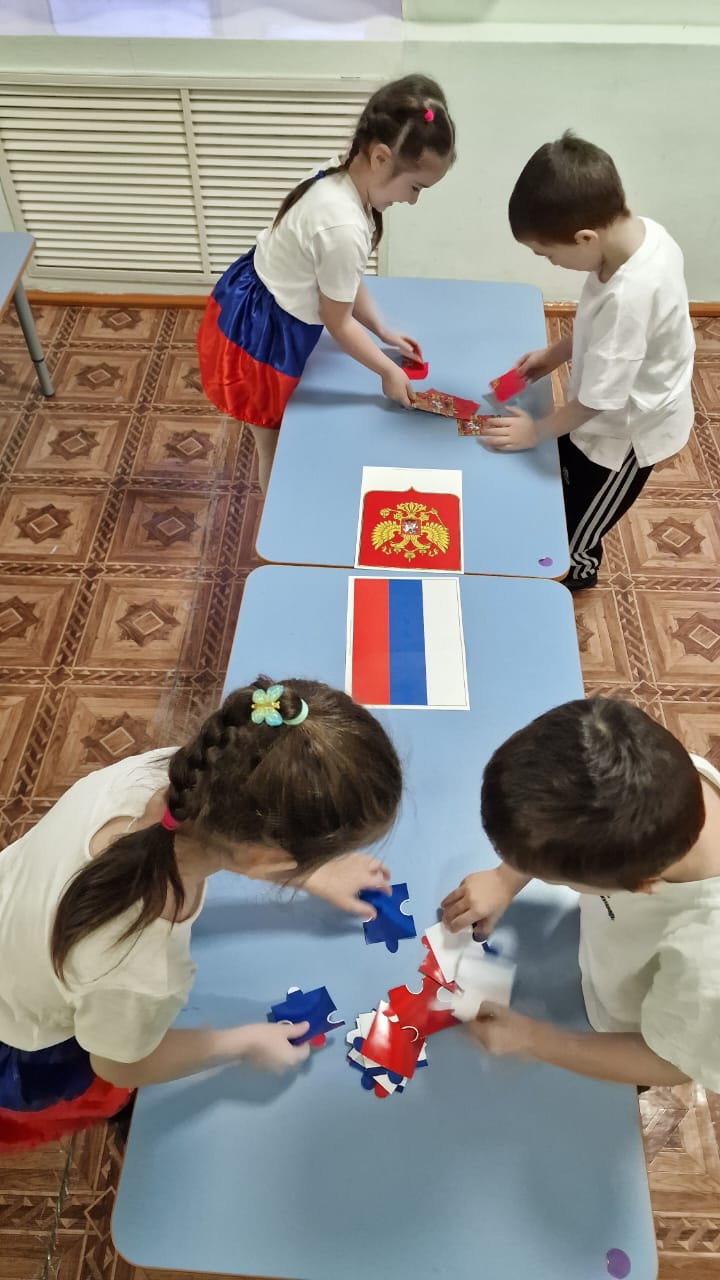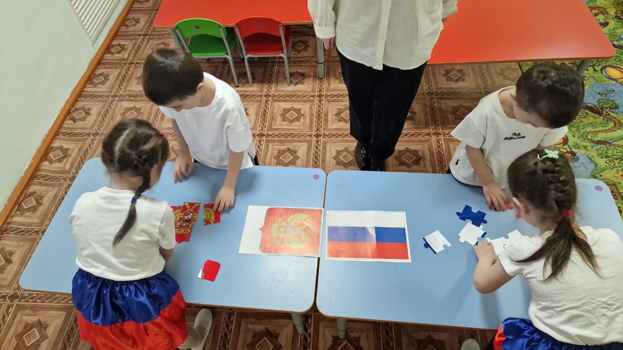 Проводится игра, связанная с государственными символами России. Они собирают пазлы , на которых изображены элементы, ассоциируемые с Россией: флаг и герб РФ. Игра направлена на развитие у детей знаний о государственных символах, а также на улучшение их мелкой моторики и навыков совместной работы. Дети активно взаимодействуют друг с другом, что способствует развитию коммуникативных навыков и командного духа.
