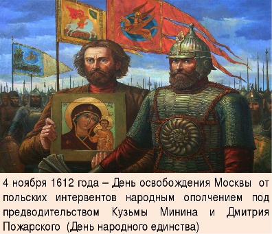 аступили тяжелые времена. Страна и народ были измучены до крайности. Многие всерьез поговаривали об окончательном падении московского царства. И тогда нижегородский земский староста Кузьма Минин и один из лучших военачальников, князь Дмитрий Пожарский, известный своей храбростью и честностью, призвали весь народ встать на защиту Отечества. (Слайд 2) Им удалось собрать войско невиданных размеров, в состав которого входили представители всех сословий и народностей, проживавших на территории России (то самое народное единство, которое мы отмечаем 4 ноября). Поляки были изгнаны из Москвы. Смутные времена закончились.