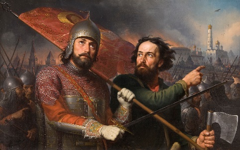 Вот герои - избавители России: простой человек Кузьма Минин и воевода князь Дмитрий Пожарский. Они сумели собрать на битву народ и освободили Москву от врагов. Вскоре и вся русская земля была очищена от иноземных захватчиков. Так, в трудные времена проявились лучшие черты русских людей: стойкость, мужество, беззаветная преданность Родине, готовность ради нее пожертвовать жизнью.(Слайд 3)