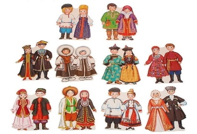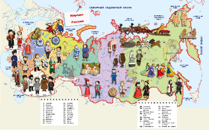 -Давайте рассмотрим карту нашей большой страны и узнаем, люди каких национальностей тут проживают. (Слайды 5,6. Просмотр иллюстраций, обсуждение сходств и различий внешности и народных костюмов)