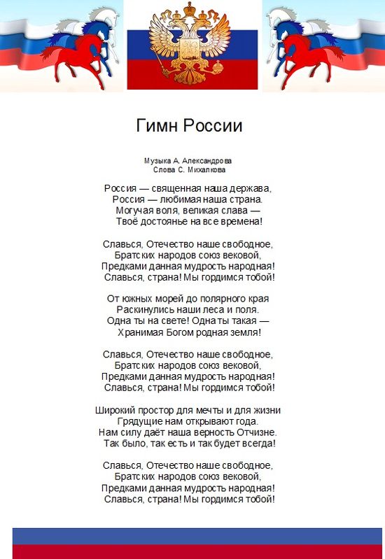 Гимн – официально принятая торжественная песнь в честь государства. Гимн менялся несколько раз за российскую историю, что было связано с формой государственного устройства, теми, кто руководил страной. Музыка гимна величавая, торжественная. Гимн слушают и поют стоя, сняв головные уборы.