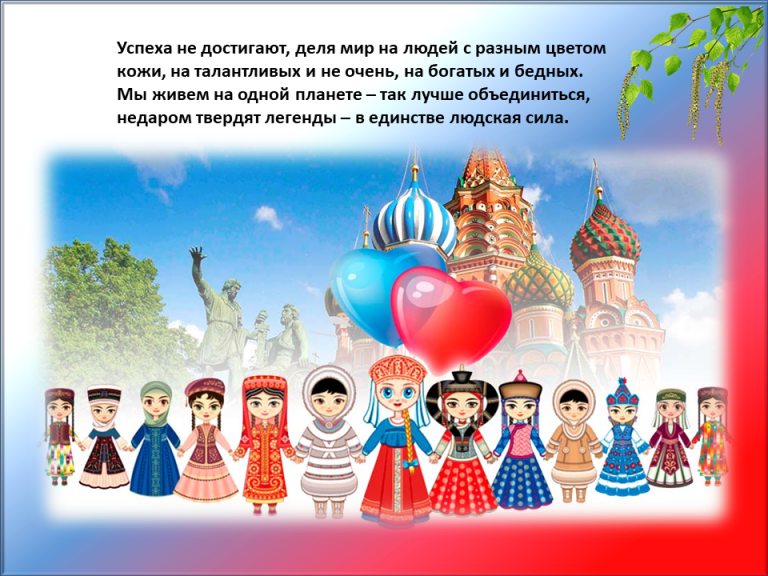 — Россия — большая и красивая страна. В ней живут люди разных национальностей: русские, татары, чеченцы, буряты, чуваши и многие другие. Все они — одна большая семья, потому что у них одна Родина.