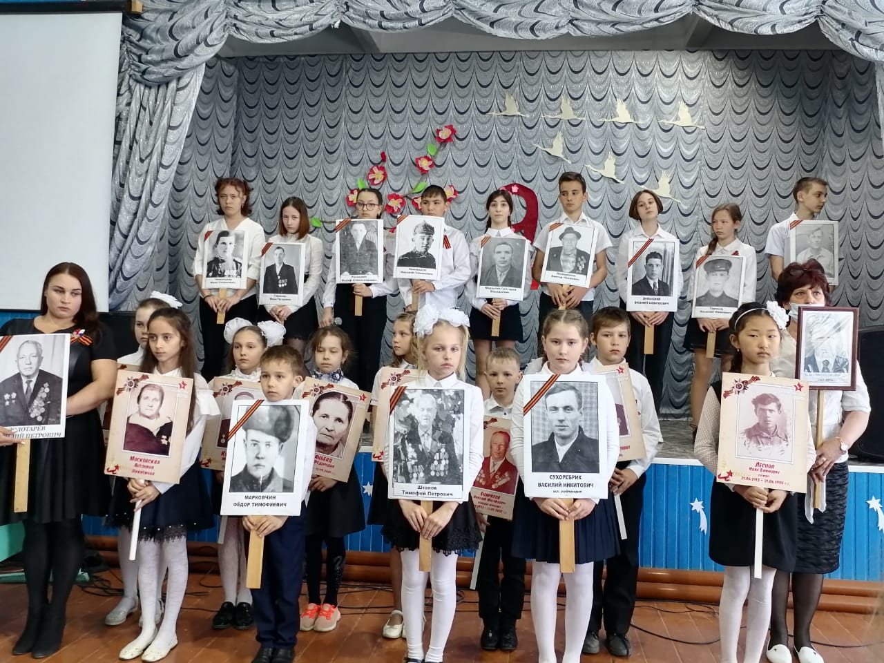 Ведущий 2: Она стартовала в городе Томске, в 2012 году. В 2013 году к Бессмертному полку присоединились 120 городов и населенных пунктов России и на сегодняшний день акцию поддерживают уже тысячи регионов нашей страны! В ряды бессмертного полка вступили и наши сёла Звонарёвка, Бобровка и Красная поляна.