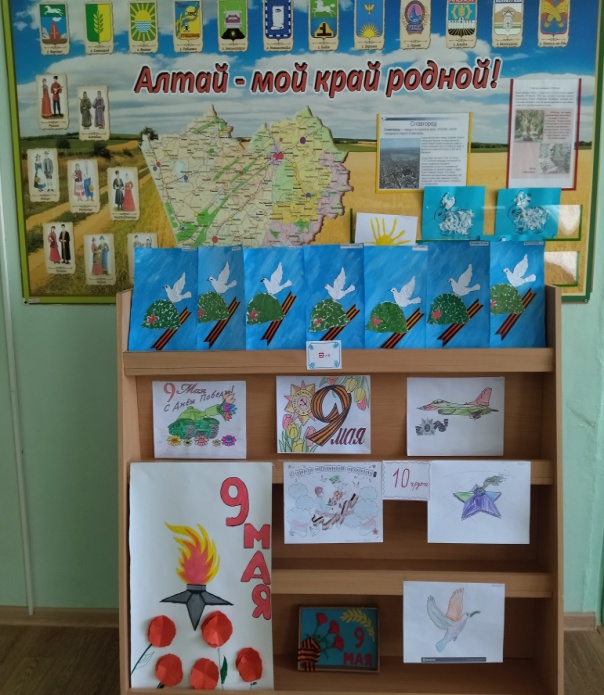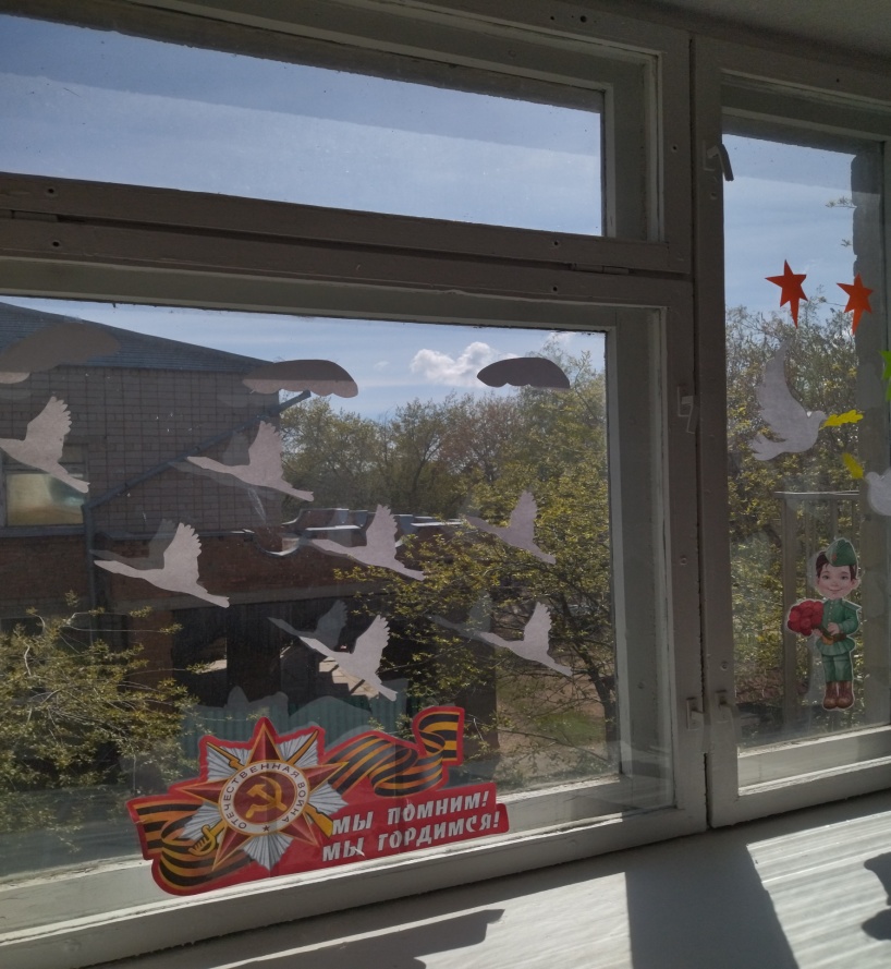 В группах проводились беседы: «Памятное место нашего города Славгорода», «Чтобы знали, чтобы помнили», «Мемориал Славы». Также ребята рассматривали иллюстрации, открытки, альбомы .Просмотрели презентации «Дети войны» и «Военная техника и рода войск».Наши воспитанники вместе с воспитателями стали участниками акции «Окна победы»,а также приготовили выставку рисунков «Тепло детских ладошек».Посетили мероприятия в детской библиотеке, читали много рассказов о войне, разучивали стихи, слушали и пели песни военных лет. А также оформили стену «Марафон памяти», на которой вспоминали всех павших и живых, кто каждую букву в слове Победа освещал и ранами и потерями и жизнью.