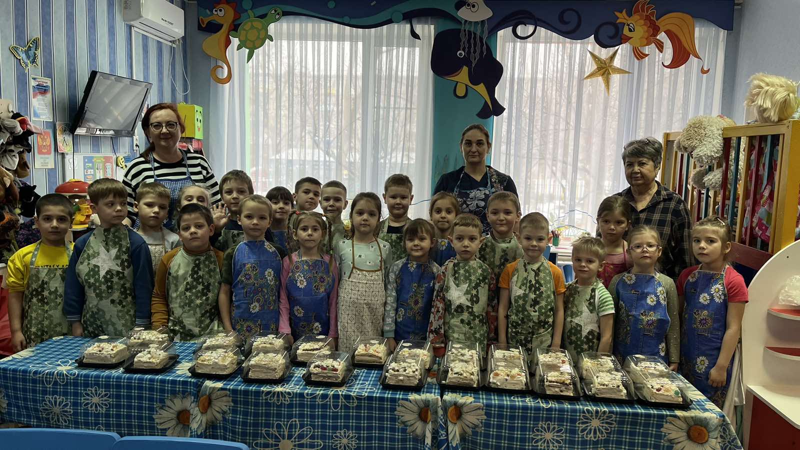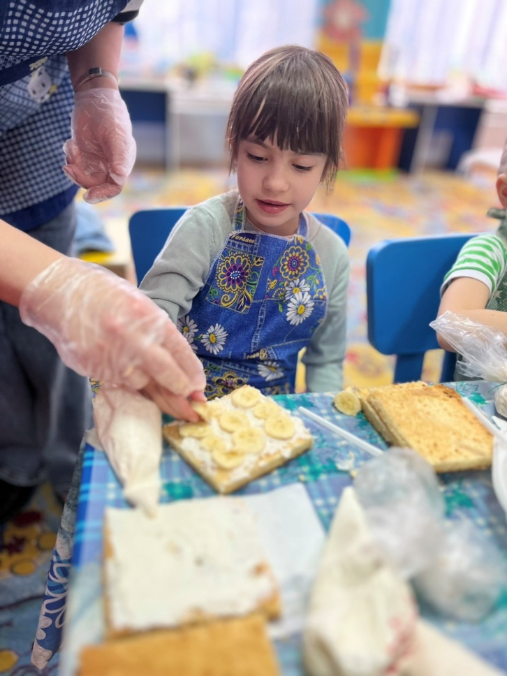 Во время обсуждения с детьми идеи подарка, Роберт К. рассказал, что они вместе со своей мамой, кондитером, приготовили сладкий подарок для бабушки. Ребят очень заинтересовал этот рассказ и они спросили, а можем ли мы в саду своими силами испечь мамам торт? Посоветовавшись секретно с родителями, решили помочь детям и организовать с их помощью оформление тортиков для мам из готовых коржей, которые приготовит мама кондитер.