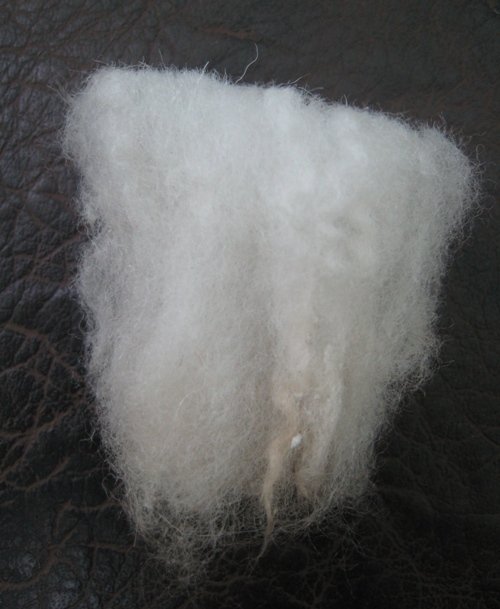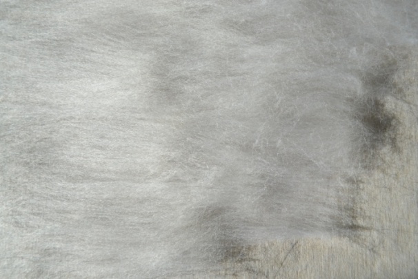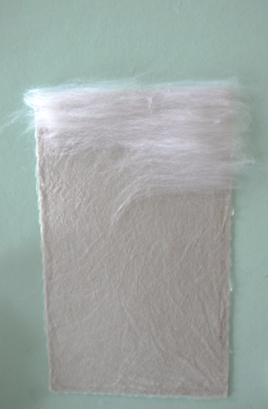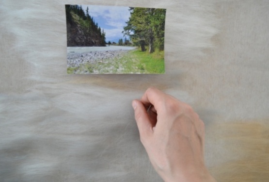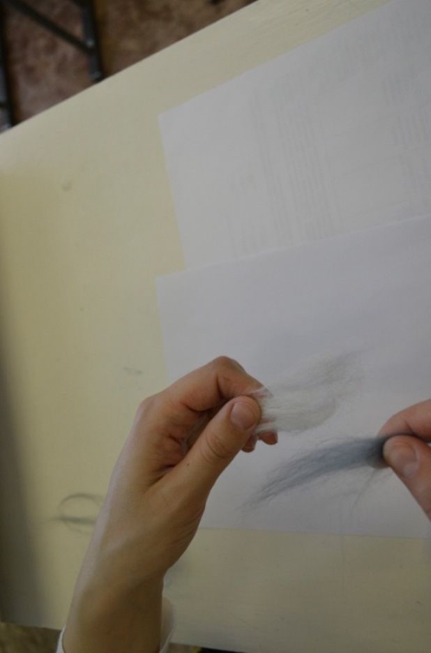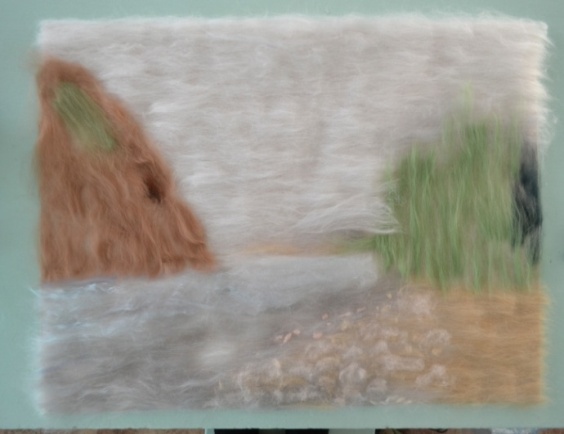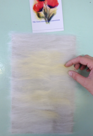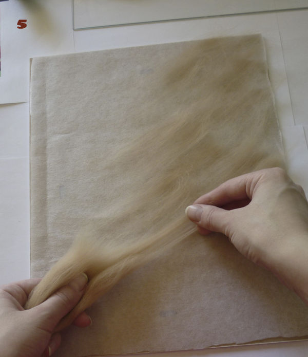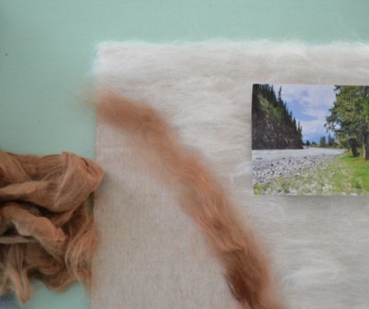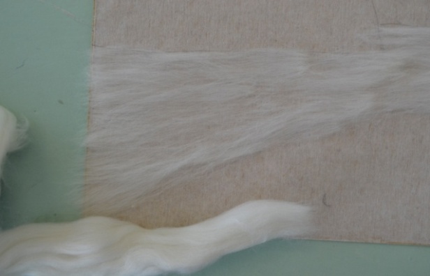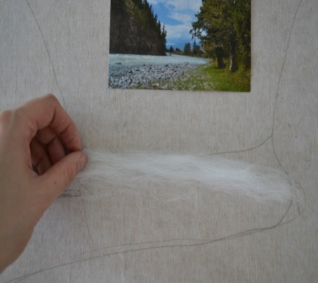 3 этап. В первую очередь необходимо разложить белую шерсть на светлые места, там, где будут изображены река и небо. Нужно использовать именно белую шерсть, как и в акварельных красках, так и в шерстяной акварели, чтобы послойно изобразить светлоту цвета и прозрачность слоев. Разложение шерсти происходит путем вытягивания из гребенной ленты длинных волокон. Пряди шерсти постепенно подложить одни к другим, образовывая ровное полотно (рисунок 10). Все пряди расположить горизонтально, равномерно, без завитков (рисунок 11).