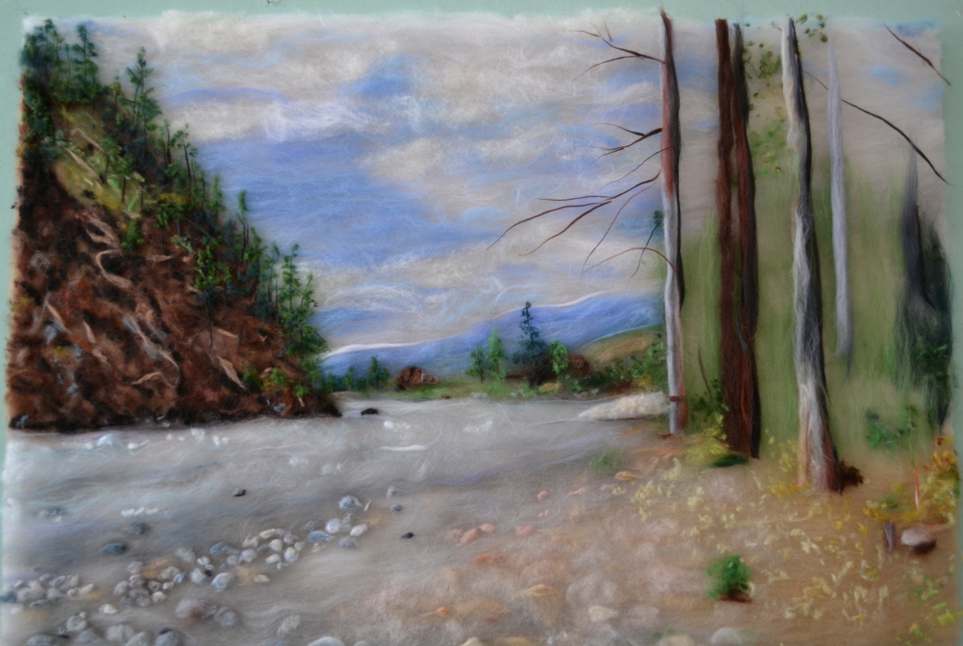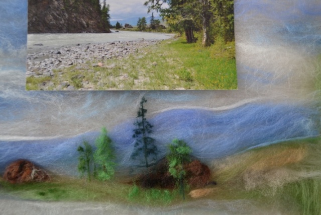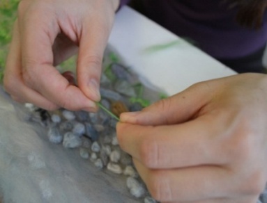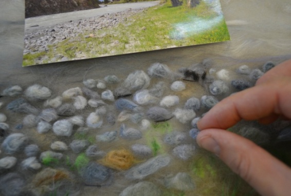 Из получившейся смеси шерсти изготовить камни различного диаметра и оттенка путём скручивания между пальцев рук (рисунок 22). Камни разложить вдоль берега реки, соответственно фотографии.