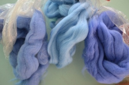 этап. С помощью различных оттенков голубой шерсти (рисунок 14 -а) «нарисовать» небо, а облака выложить из кардочёсанной шерсти – это шерсть, больше похожая на вату, волокна которой направлены в разные стороны (рисунок 14 б). Кардочёс – это овечья шерсть, прошедшая только первую ступеь очистки. Получим голубое небо, с плывущими по нему облаками (рисунок 14-в)