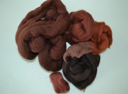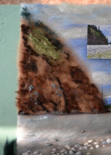 7 этап. Для изготовления склона горы использовать гребенную ленту коричневых оттенков (рисунок 17 - а). Соответственно фотографии распределить коричневую шерсть путём нарезки непосредственно над необходимым местом, передавая неровности поверхности горы, а также участок, заросший травой (рисунок 17 - б). Вдоль склона горы использовать приём нарезки мелких деталей темно-зелёной шерстью (рисунок 17 - в).