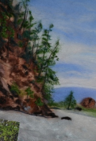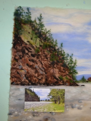 6 этап. Следующим этапом рисования шерстью будет изображение заднего плана (рисунок 15), расположенного в центре картины по линии горизонта. Выложить из коричневой шерсти разных оттенков два больших камня, рядом с которыми расположены лиственницы и ели.