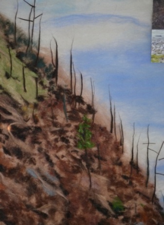 Используя приём скручивания, изготовить и разложить вдоль склона стволы деревьев из тёмно-коричневой шерсти, а затем приёмом нарезки мелких деталей из зеленой шерсти сделать хвою (рисунок 18).