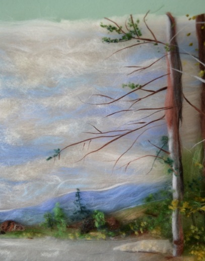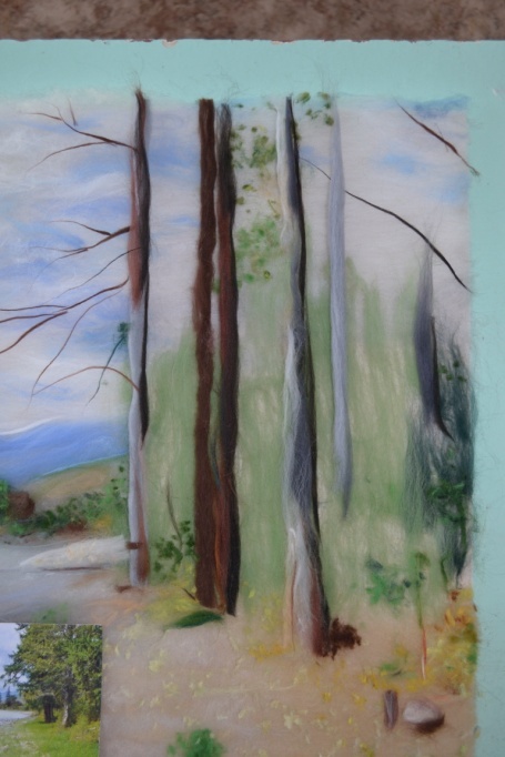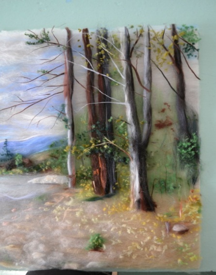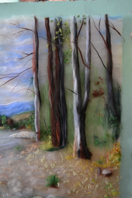 8 этап. Отделить от гребенной ленты длинные волокна шерсти коричневого и серого цвета и скрутить между ладоней высокие стволы лиственных деревьев, а затем разложить их в нужных местах, соответственно фотографии. Скрутить и разложить ветви (рисунок 19)