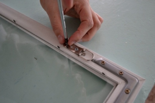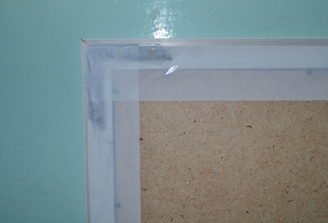 Концы багета срезаны под углом 45˚ и соединены на клей и скобы. В раме установлен задник, выполненный из ДВП, а также стекло. Задник из ДВП и стекло удерживаются в раме при помощи гибких гвоздей. Для усиления прочности конструкции пластиковой рамы, по углам, при помощи шурупов прикручены металлические уголки. Для дальнейшего размещения картины на стене, на расстоянии 8 см от верхнего края рамы прикручены подвески (рисунок 25а).