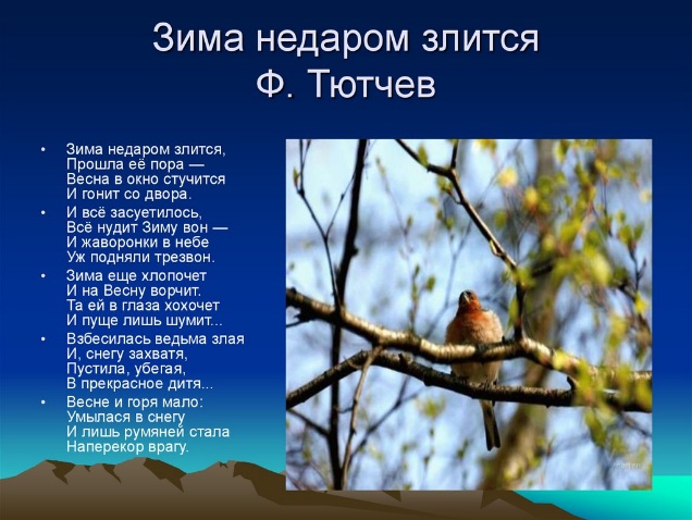 - Какому весеннему месяцу посвящено это стихотворение? Верно, марту.