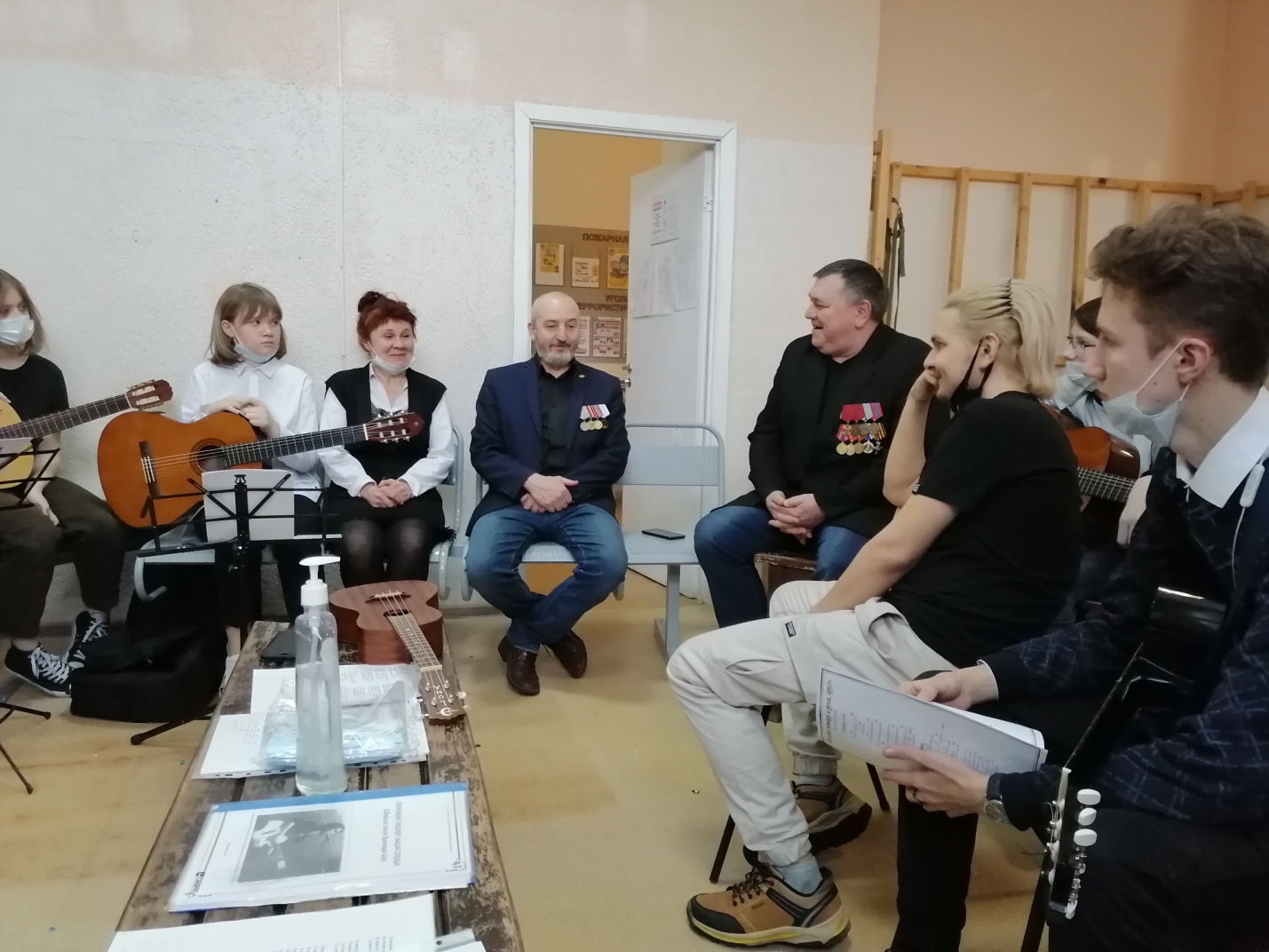 Организационная часть. Педагог встречает обучающихся объединений «Поющая гитара», «Классическая гитара», родителей гостей. Предлагает посмотреть представленные армейские фотоальбомы: Кропачева А.В. и Демидова В.В., ветеранов Афганской и Чеченской войн. Затем всех приглашают сеть в круг с гитарами и приглашает Кропачева А.В. и Демидова В.В. На столе приготовлены сборники песен с аккордами и отдельные листочки с текстом песен, которые запланировано исполнять всем вместе.