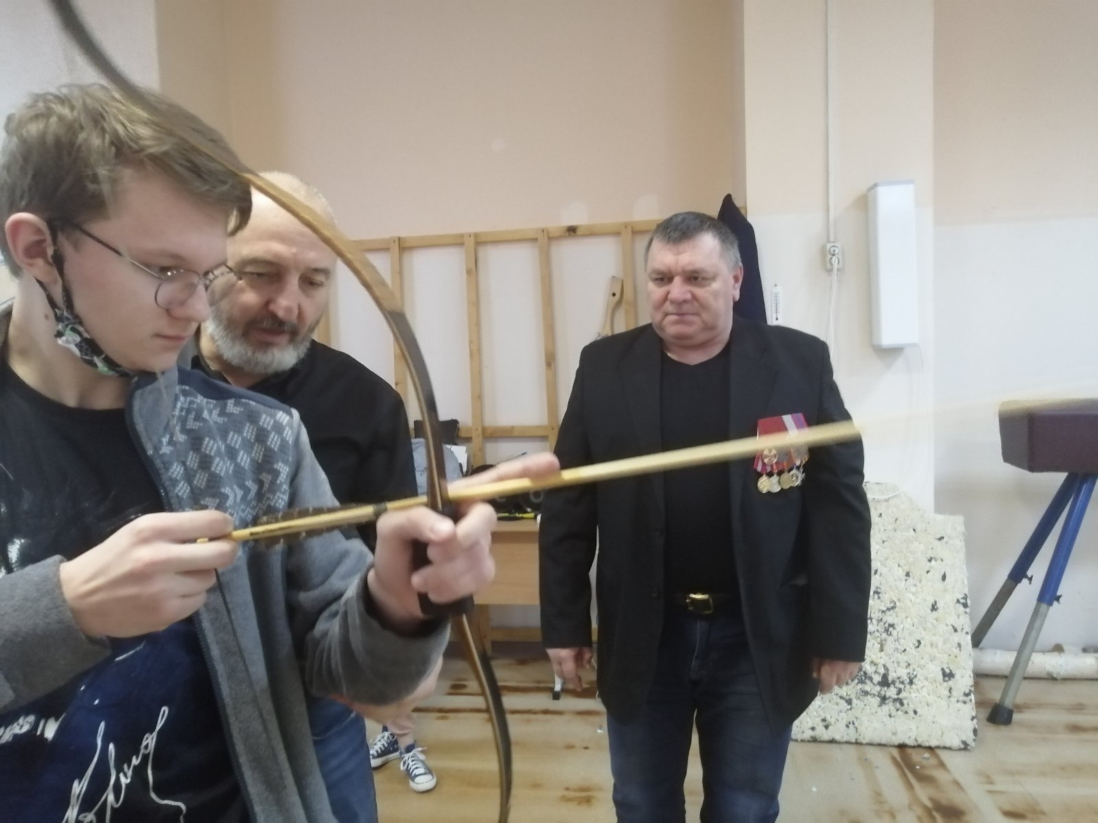 Мастер-класс: «Стрельба из лука». Вначале, инструктаж по технике безопасности, рассказ о строение лука, о его особенностях стрельбы, правильная постановка корпуса, рук, натяжение тетивы, направление стрелы и т.д, и только после этого предлагается выстрелить из лука под чутким вниманием В.В.Демидова и А.В.Кропачева.