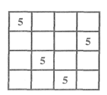 асставьте четыре числа 5 в таблице так, чтобы в каждой строке, в каждом столбце и по двум диагоналям встречалось только одно число.