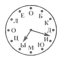 Решив пример, ученик записывает не ответ, а букву, соответствующую этому числу, которую находит на циферблате часов и быстро передает мел следующему ученику, а сам садится на место. Если все примеры решены верно, и ответы правильно записаны буквами, то болельщики каждой команды прочитают слово «МОЛОДЦЫ».