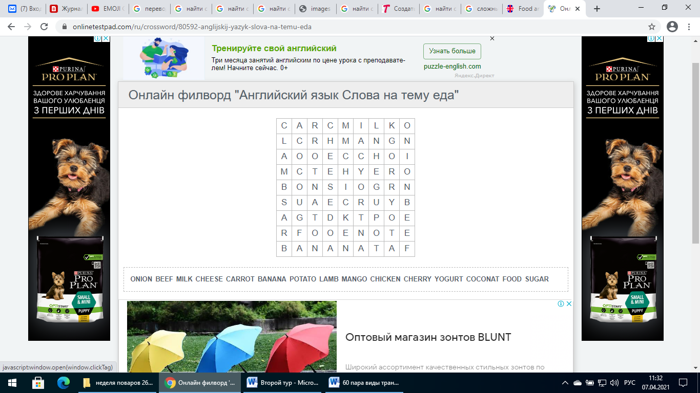 T: Our first contest is Warming up one. (Разминка) Now You have a short puzzle, you have to guess it. Look at the screen, please. So, you are going to find some words about food. It may by Vegetables, Fruits, Meat, Beverages/drinks. Look at the slides! I hope you remember a lot of words on topic “Food”.