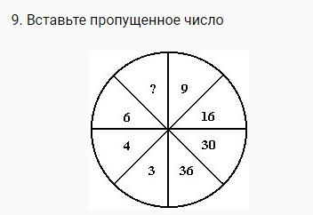 | 6 (Числа, стоящие справа, нужно разделить соответственно на 3, 4, 5, 6 чтобы получить числа противоположных секторах) 9:3=3, 16:4=4, 30:5=6, 36:6=6 |