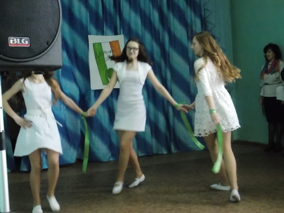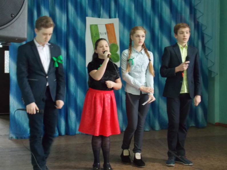 Р1: В день Святого Патрика ирландцы надевают национальные костюмы или облачаются в наряды зеленого цвета – национального цвета Ирландии, обязательно вдевают в петлицу пиджака листочек клевера, символизирующего Родину и привлекающего удачу, пускаются в пляс и поют народные песни.