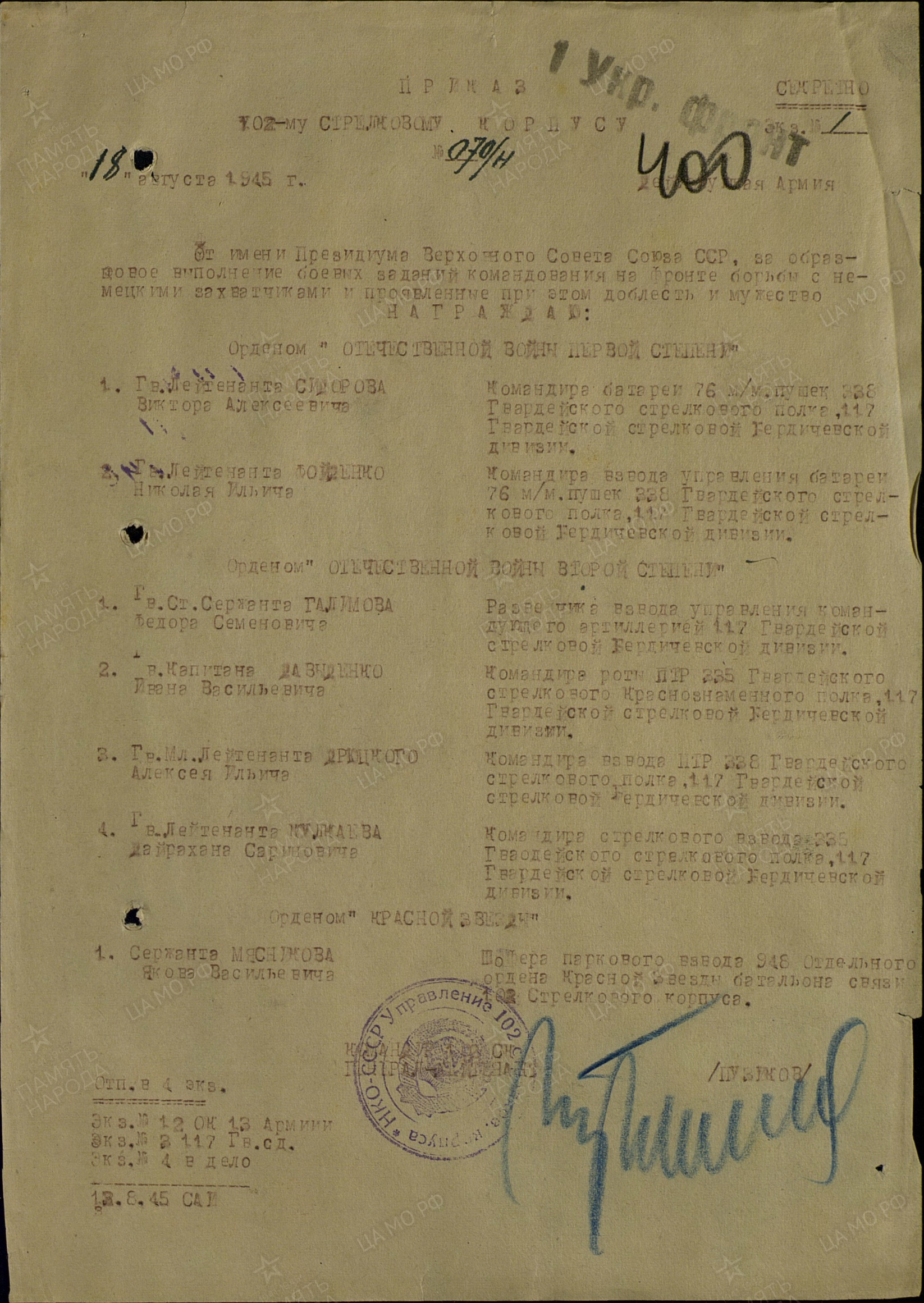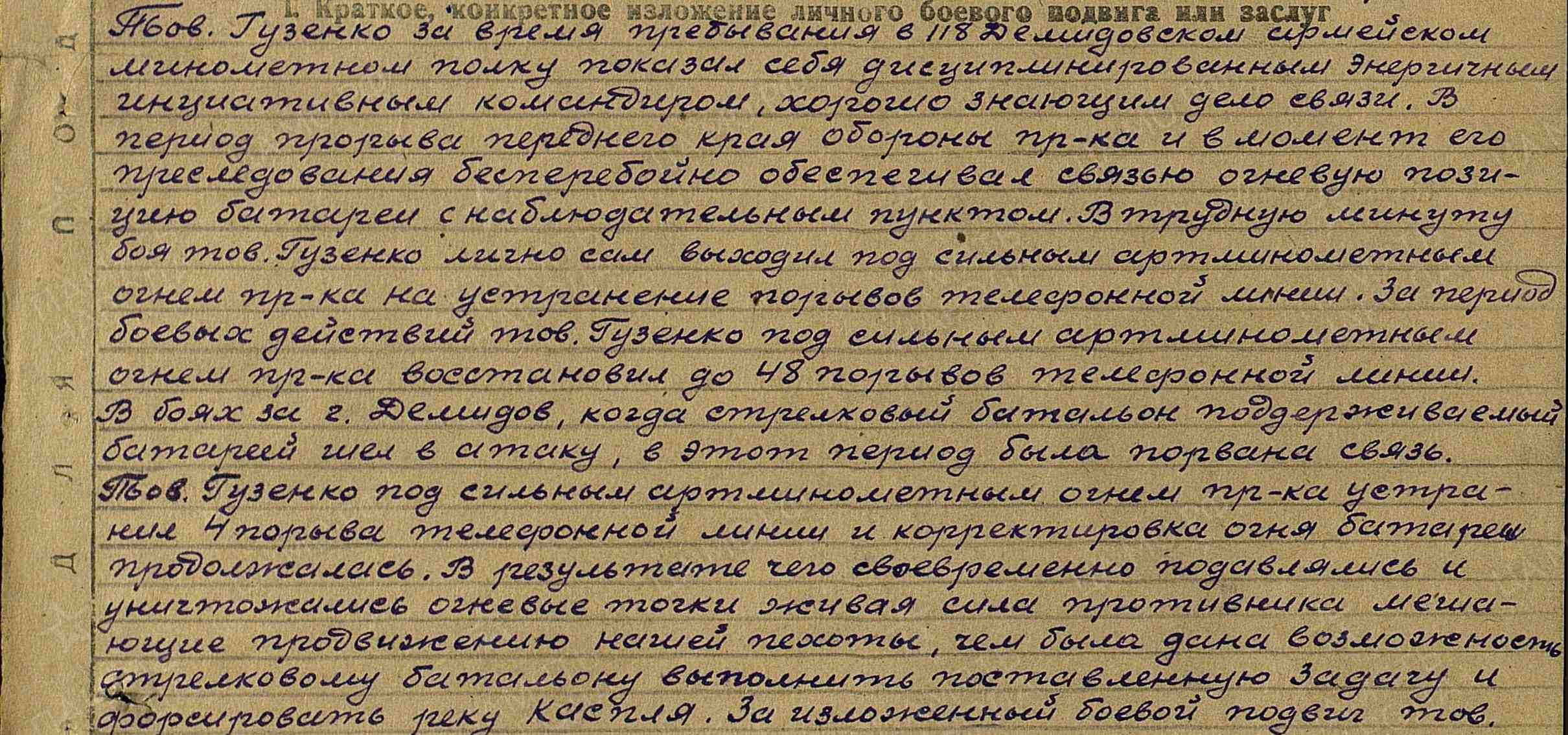 Даниил:«Моего прадеда зовут Гузенко Якова Андреевича . Он родился в 1898 году. В 1941 году, как и многие другие, ушел на фронт. Воевал под командованием Г. К. Жукова на Украинском фронте. Был ранен в плечо. Лежал в госпитале в Кенигсберге. Принимал участие в освобождении Бреста, Киева, Кенигсберга, Варшавы, Берлина. Награжден орденом Красной Звезды, медалями за взятие Бреста, Варшавы, Берлина. В 1946 году вернулся домой, а1972 году его не стало.»