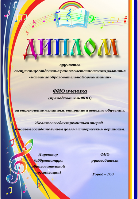 дипломы для юных артистов (образец представлен в приложении к данному сценарию): 17 шт.